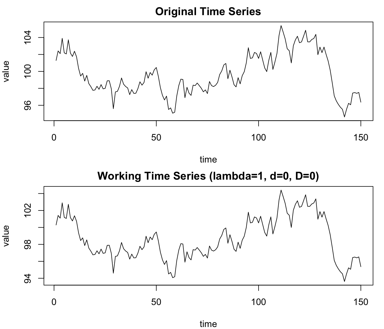 Finally we set \(d = D = 1\) to apply ordinary and seasonal differencing before recomputing the ACF. The R module shows that the combined differencing procedures eliminate the trend and the seasonal pattern. We can see this in the ACF because it does not exhibit the typical seasonality pattern anymore.