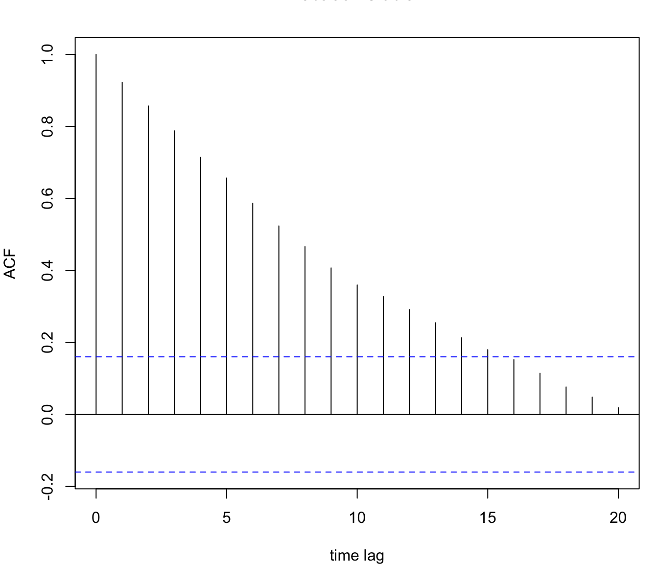 The Autocorrelation Function (ACF) of a time series \(Y_t\) relates sequential correlations (on the y-axis) \(\rho_k = \rho(Y_t, Y_{t-k})\) for \(k = 1, 2, …, K\) to the time lag \(k\) (on the x-axis). Often this is presented in graphical form because it allows to quickly detect patterns that are typical of the dynamical properties of the underlying time series. Note that the time lag \(k\) is sometimes called the “order” of autocorrelation.