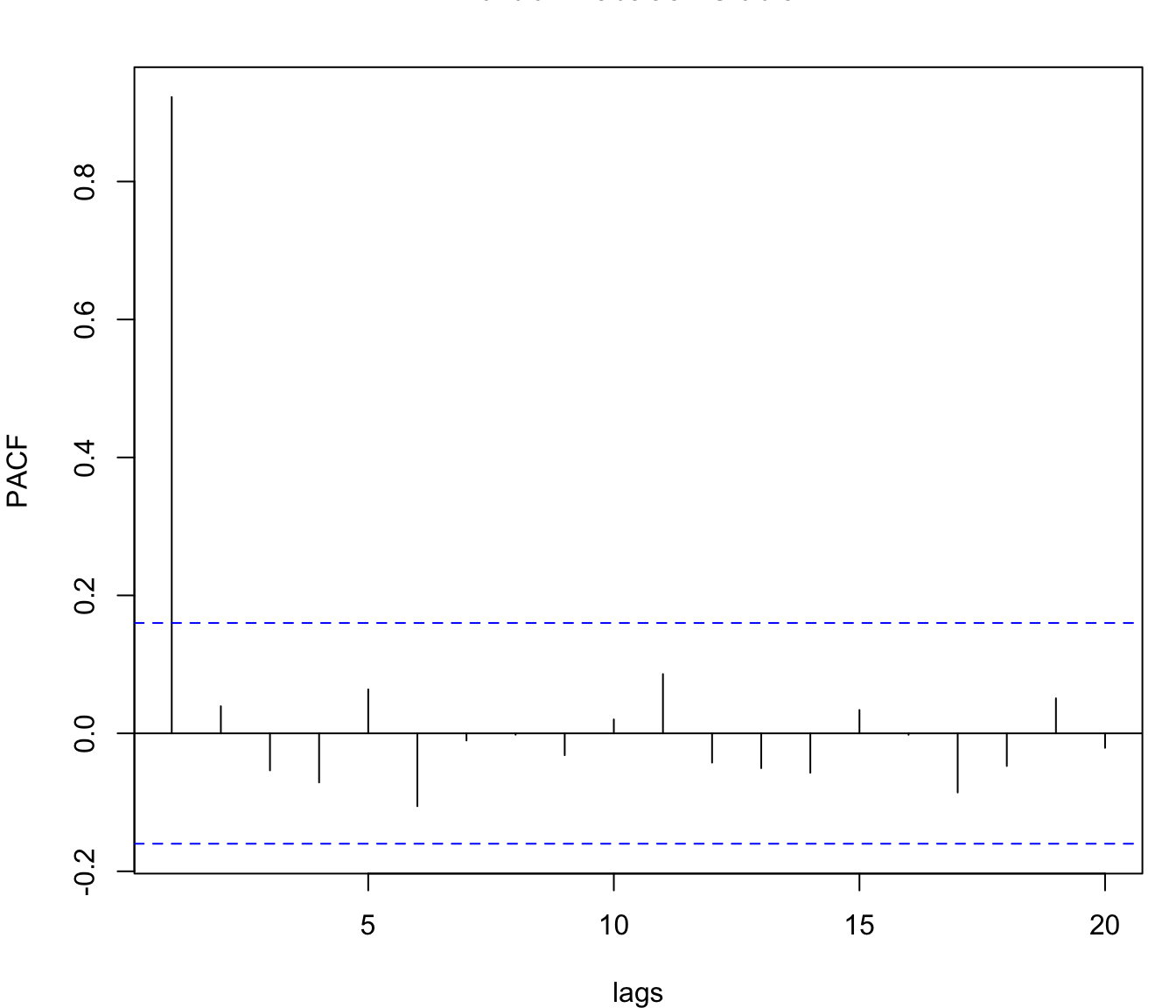 The Partial Autocorrelation Function (PACF) at lag \(k\) is the correlation between \(Y_t\) and \(Y_{t-k}\) after removing the linear effects of the intermediate lags \(Y_{t-1},\ldots,Y_{t-k+1}\). In practice, PACF isolates the direct lag-\(k\) relationship that is not explained by shorter lags.