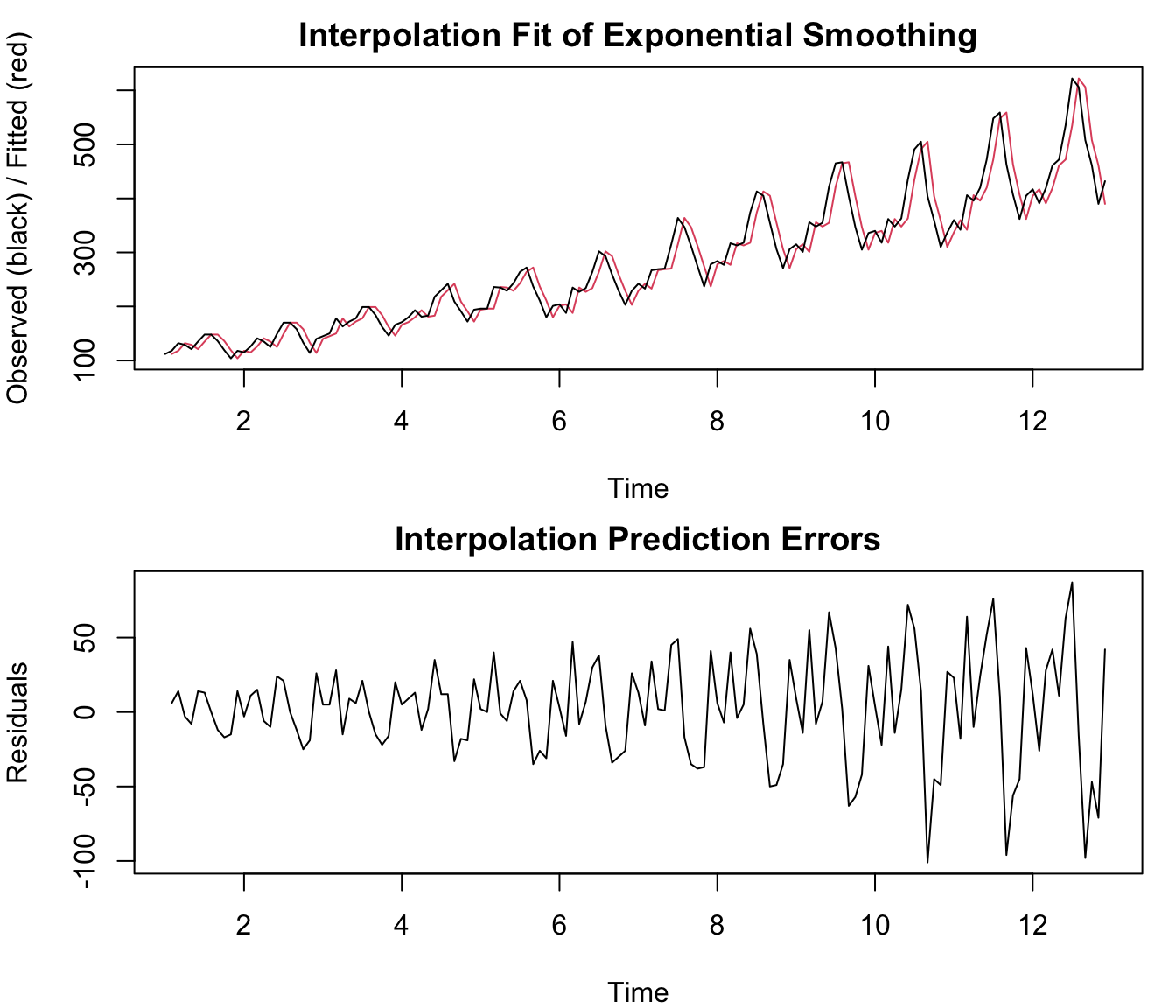 par(mar =c(4, 4, 2, 1))x <- AirPassengerspar1 =12#Seasonal periodpar2 ='Single'#Type of Exponential Smoothingpar3 ='additive'#Type of seasonalitypar4 =12#Number of Forecastsif (par2 =='Single') K <-1if (par2 =='Double') K <-2if (par2 =='Triple') K <- par1nx <-length(x)nxmK <- nx - Kx <-ts(x, frequency = par1)if (par2 =='Single') fit <-HoltWinters(x, gamma=F, beta=F)if (par2 =='Double') fit <-HoltWinters(x, gamma=F)if (par2 =='Triple') fit <-HoltWinters(x, seasonal=par3)print(fit)print(fit$fitted)(myresid <- x - fit$fitted[,'xhat'])op <-par(mfrow=c(2,1))plot(fit,ylab='Observed (black) / Fitted (red)',main='Interpolation Fit of Exponential Smoothing')plot(myresid,ylab='Residuals',main='Interpolation Prediction Errors')