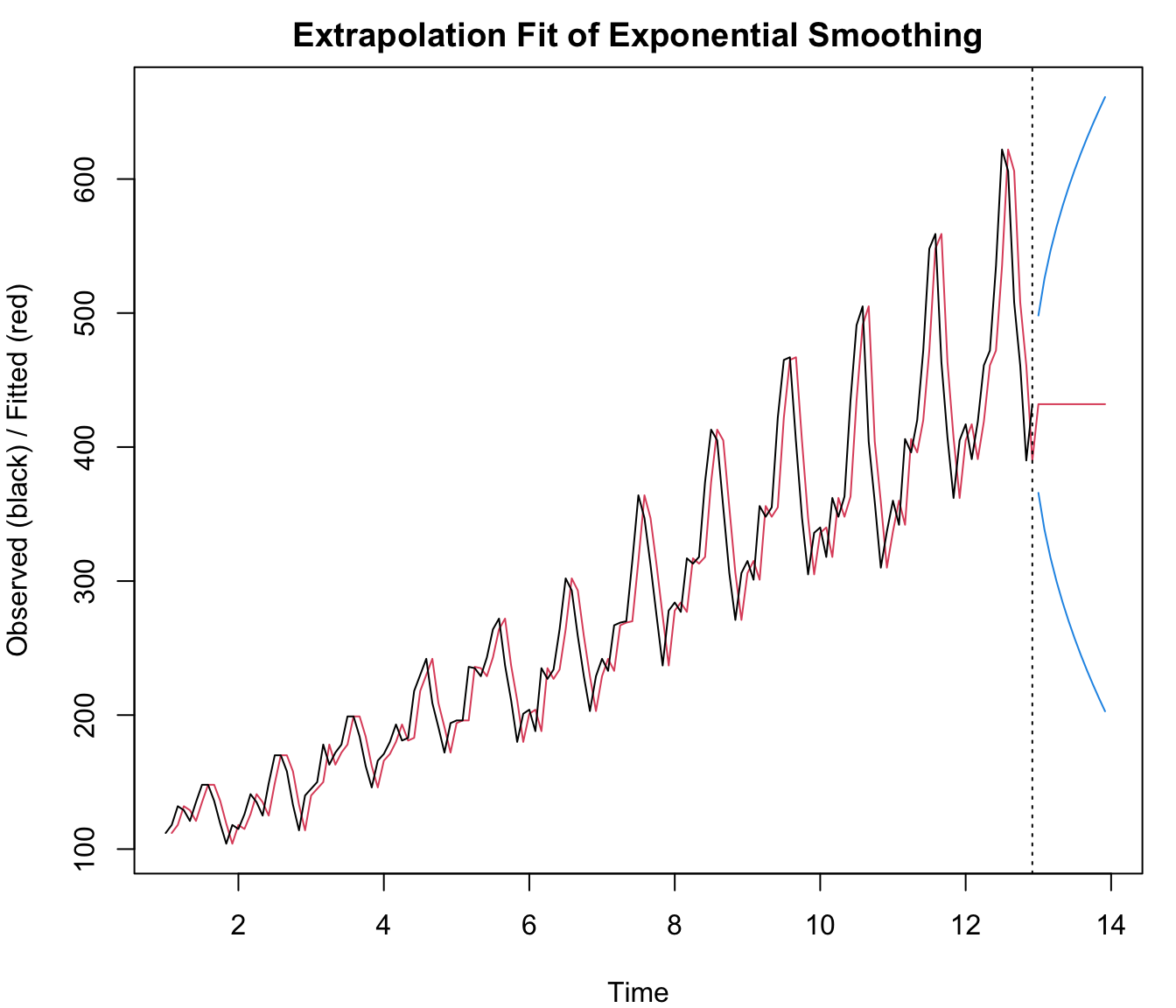 par(op)p <-predict(fit, par4, prediction.interval=TRUE)np <-length(p[,1])plot(fit,p,ylab='Observed (black) / Fitted (red)',main='Extrapolation Fit of Exponential Smoothing')