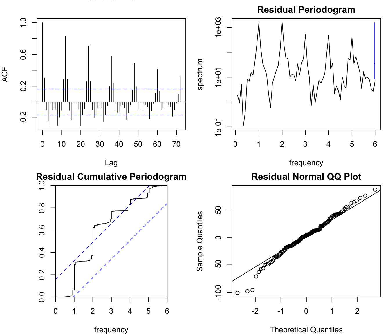 In the ACF, spectrum and cumulative periodogram there is no clear evidence of residual seasonality, which suggests that the model captures seasonal effects adequately. In addition, the Normal QQ plot suggests that residuals are approximately normally distributed. The model is not perfect because the residual ACF still exhibits a non-random (regular) autocorrelation pattern \(\hat{\rho}_{k \in \left\{ 3, 6, 9, … \right\}} > 0\) and \(\hat{\rho}_{k \in \left\{ 1, 4, 7, … \right\}} < 0\).