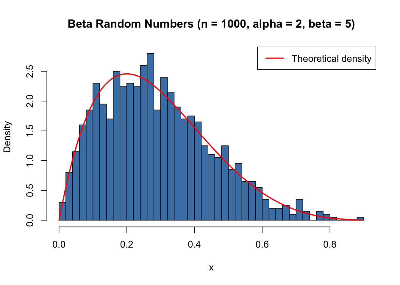 set.seed(123)x <-rbeta(1000, shape1 =2, shape2 =5)hist(x, breaks =35, col ="steelblue", freq =FALSE,xlab ="x", main ="Beta Random Numbers (n = 1000, alpha = 2, beta = 5)")curve(dbeta(x, shape1 =2, shape2 =5), add =TRUE, col ="red", lwd =2)legend("topright", legend ="Theoretical density", col ="red", lwd =2)