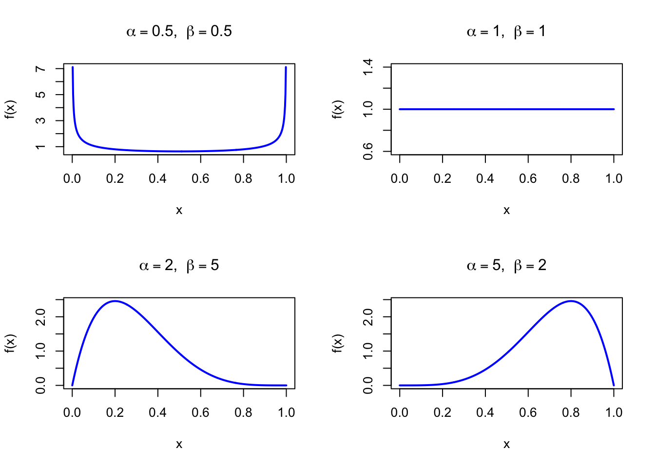 par(mfrow =c(2, 2))x <-seq(0, 1, length =500)plot(x, dbeta(x, shape1 =0.5, shape2 =0.5), type ="l", lwd =2, col ="blue",xlab ="x", ylab ="f(x)", main =expression(paste(alpha ==0.5, ", ", beta ==0.5)))plot(x, dbeta(x, shape1 =1, shape2 =1), type ="l", lwd =2, col ="blue",xlab ="x", ylab ="f(x)", main =expression(paste(alpha ==1, ", ", beta ==1)))plot(x, dbeta(x, shape1 =2, shape2 =5), type ="l", lwd =2, col ="blue",xlab ="x", ylab ="f(x)", main =expression(paste(alpha ==2, ", ", beta ==5)))plot(x, dbeta(x, shape1 =5, shape2 =2), type ="l", lwd =2, col ="blue",xlab ="x", ylab ="f(x)", main =expression(paste(alpha ==5, ", ", beta ==2)))par(mfrow =c(1, 1))