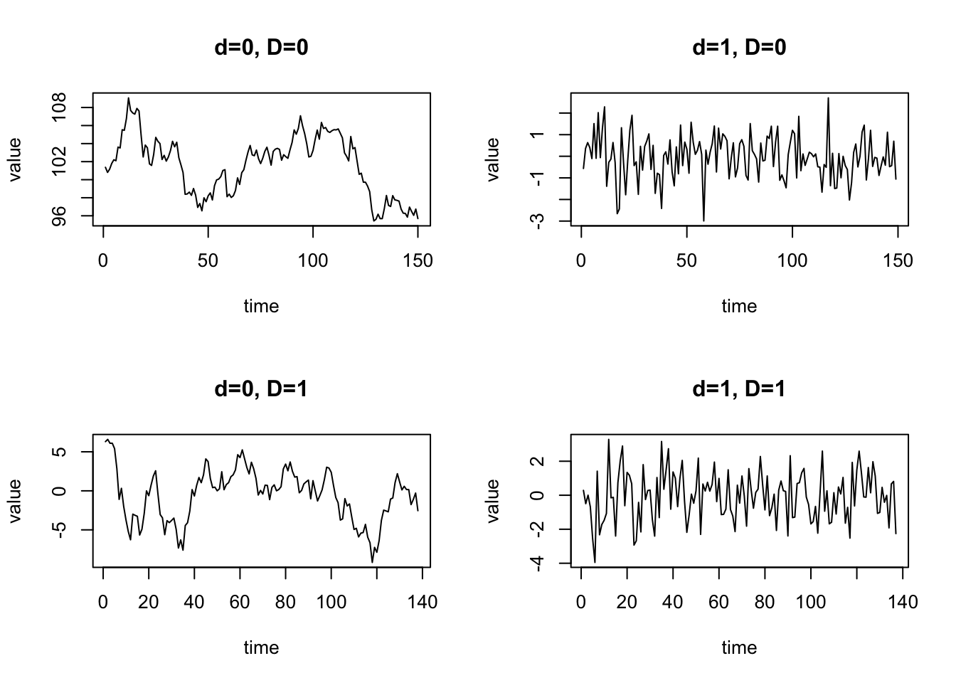 Differencing with \(d = 0\) and \(D = 1\) implies that the seasonal pattern is reduced by applying seasonal differencing: \(Y_t - Y_{t-s}\) where \(s\) is the seasonality parameter (e.g. \(s = 12\) for monthly time series).
