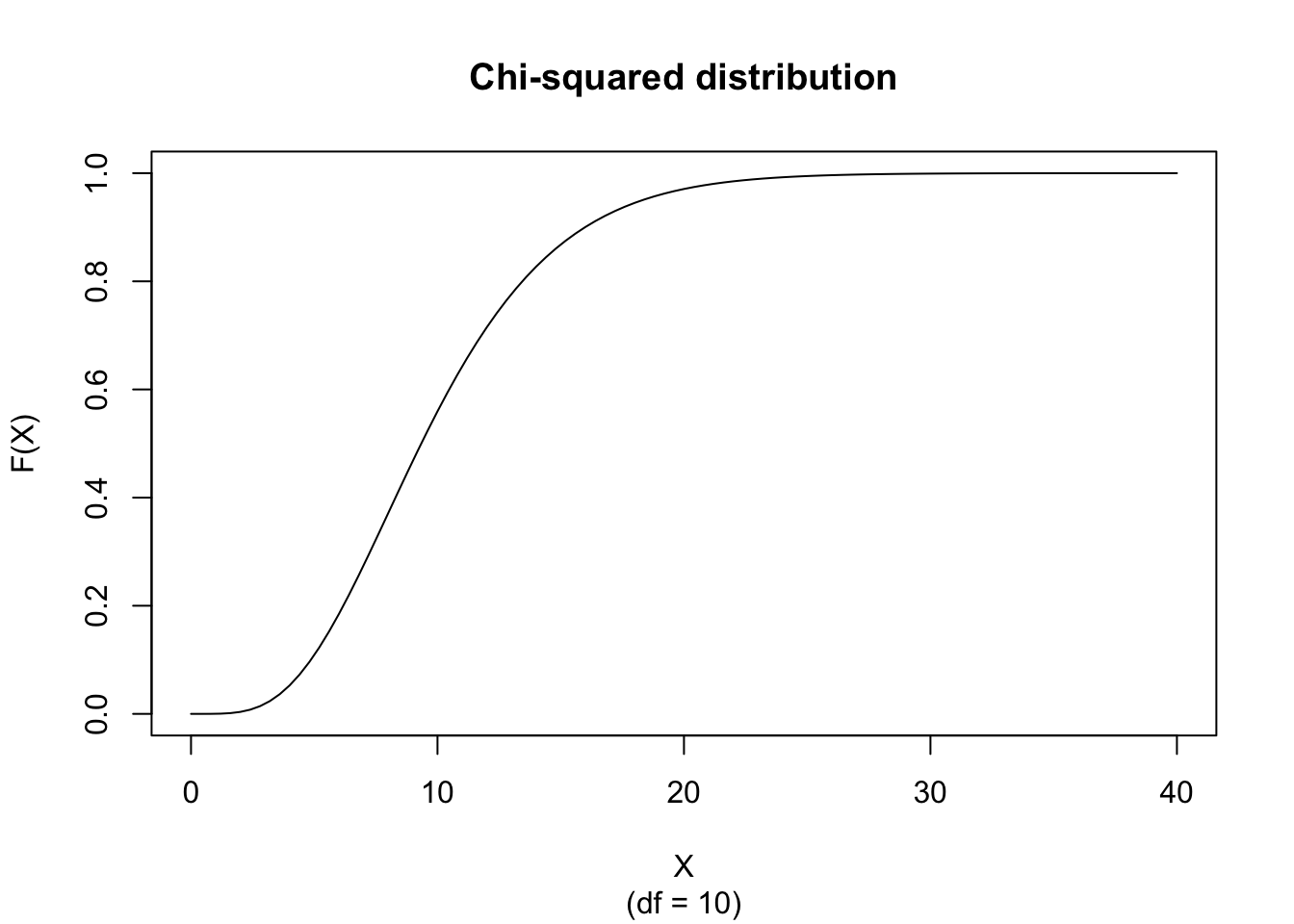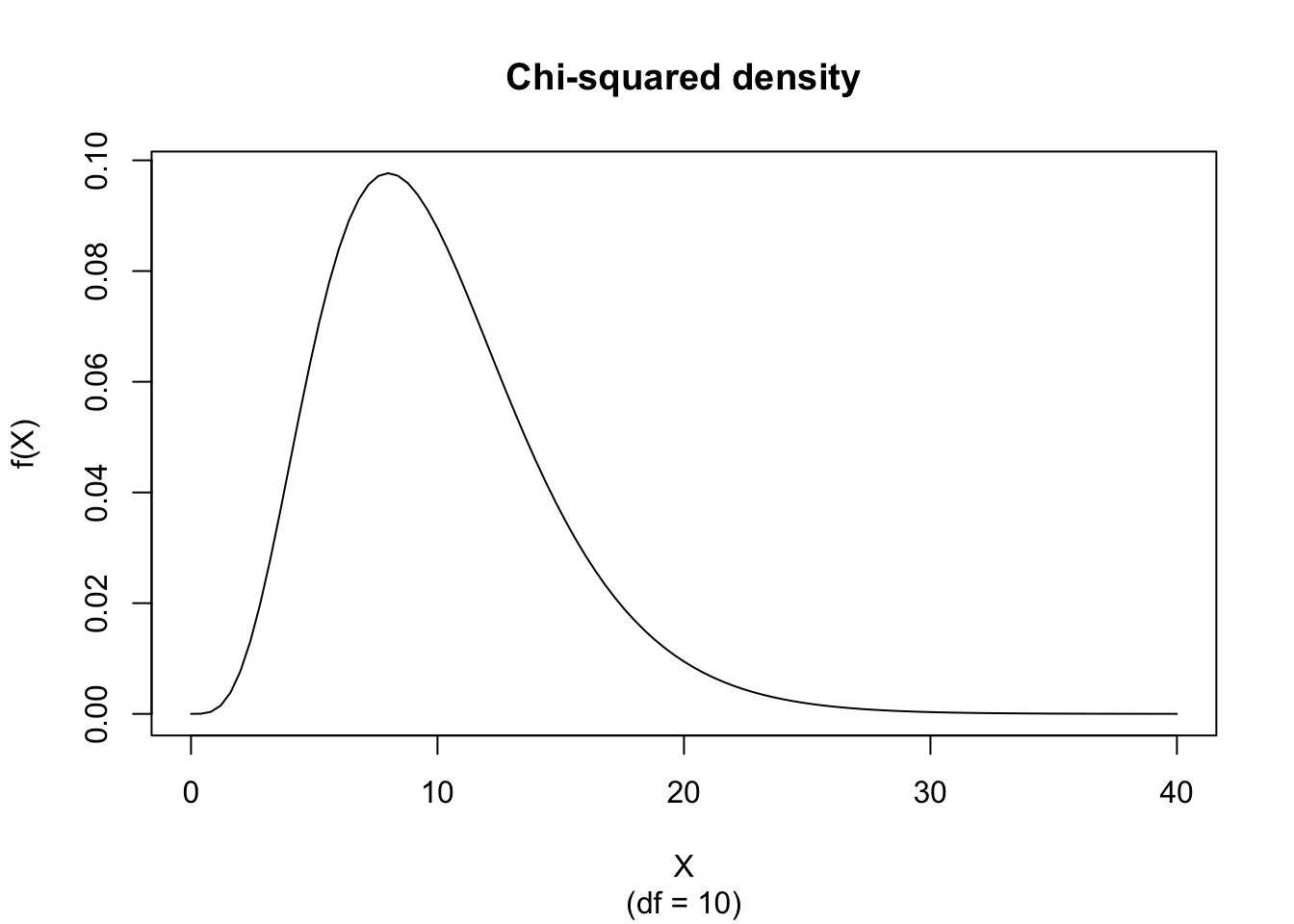 curve(dchisq(x, df = 10), from = 0, to = 40, xlab="X", ylab="f(X)", main = "Chi-squared density", sub = "(df = 10)")