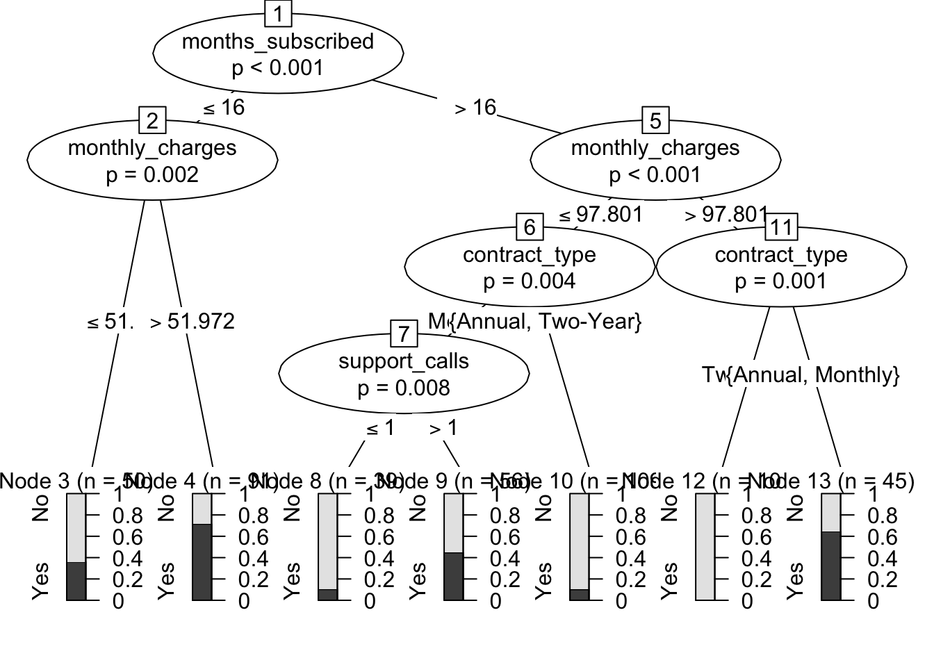 # Class predictionshead(predict(tree))# Class probabilitiesprobs <-do.call(rbind, treeresponse(tree))colnames(probs) <-levels(df$churn)head(probs)