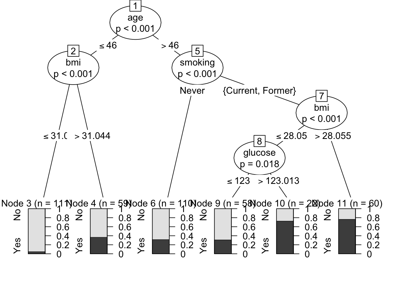 While conditional inference trees do not have a built-in variable importance measure like random forests, the variables that appear higher in the tree (closer to the root) are generally more important. The number of times a variable is used for splitting across the tree can also indicate importance. If you need a model class that formalizes importance through an ensemble rather than a single diagram, the next chapter on Chapter 142 is the natural continuation.