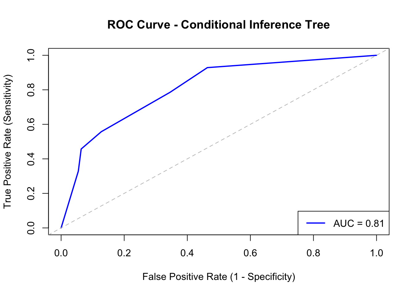 The predicted probabilities from a conditional inference tree can be used to construct ROC curves (Chapter 60) for evaluating and comparing classifier performance: