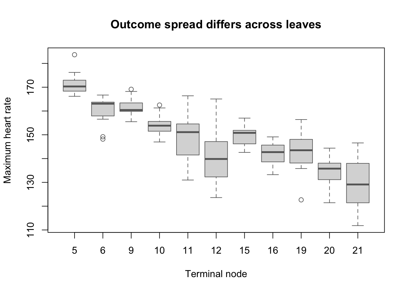 may differ strongly across leaves. This is evidence of conditional variance heterogeneity (a heteroskedasticity-like pattern in the prediction structure).