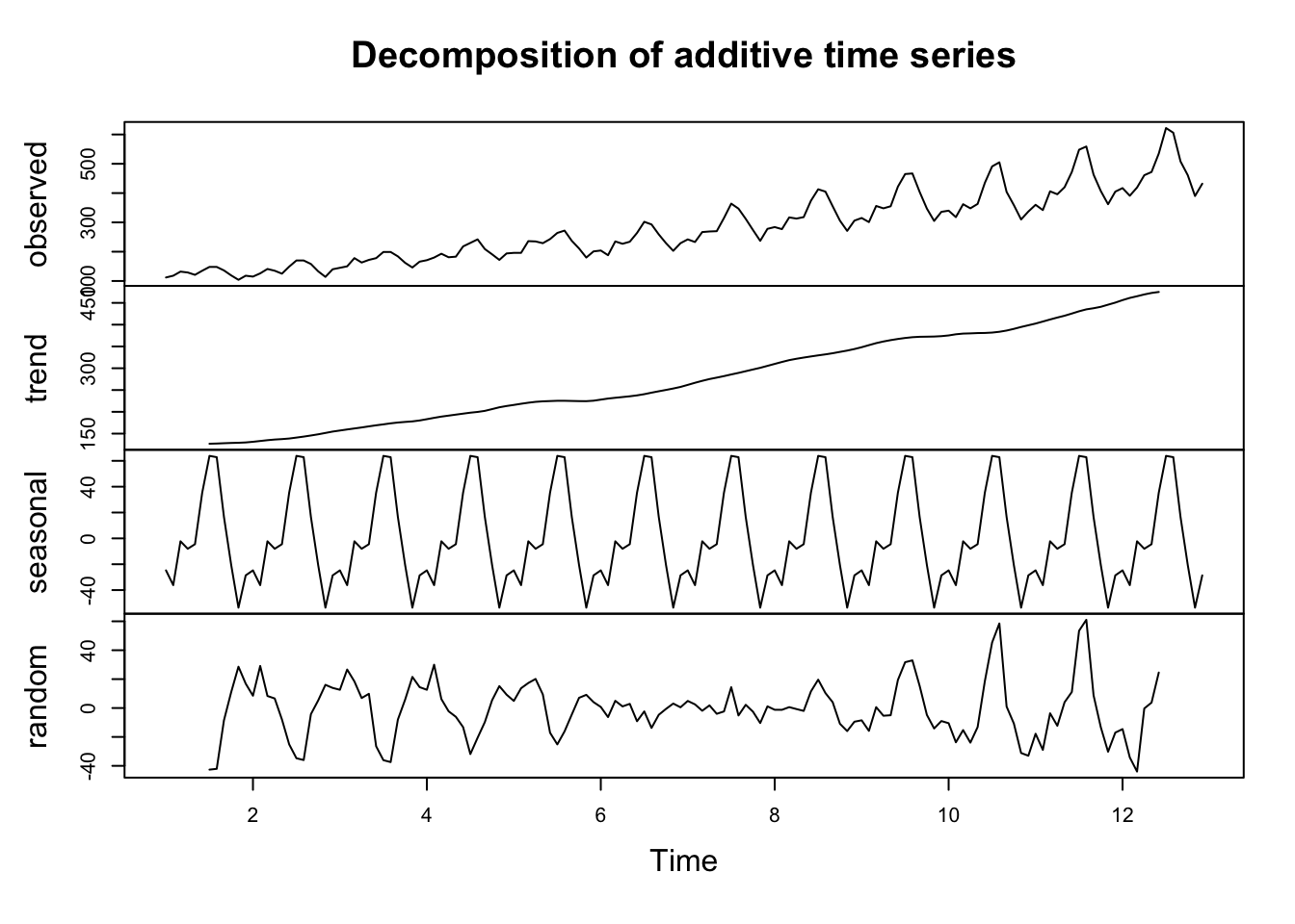 The result of the additive, classical decomposition analysis clearly shows that a positive trend is present. In addition, a strong seasonal component (showing a distinctive, regular pattern) is present which leads us to believe that it should be possible to generate predictions about the time series based on historical information.