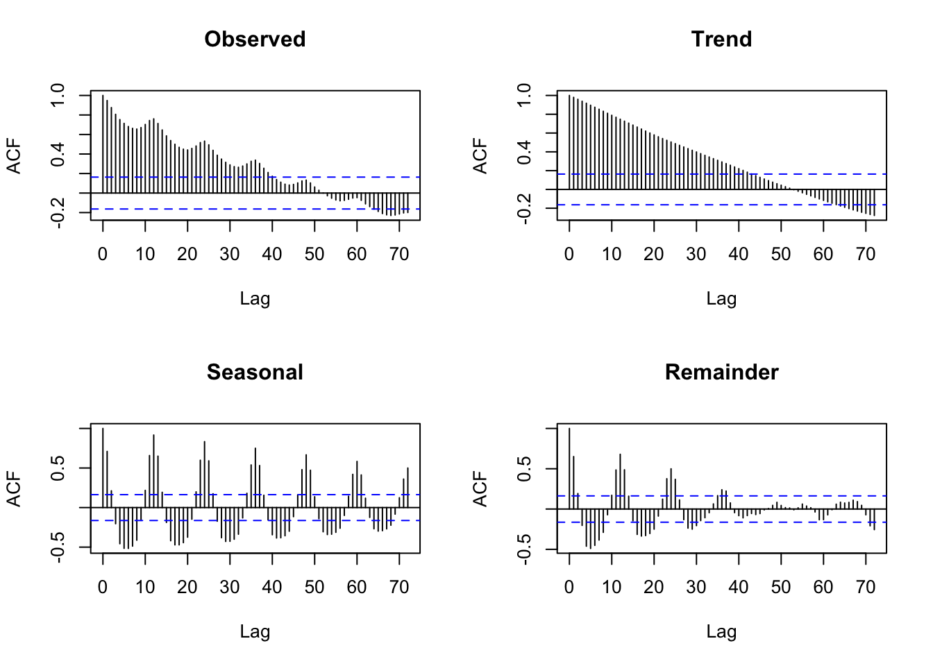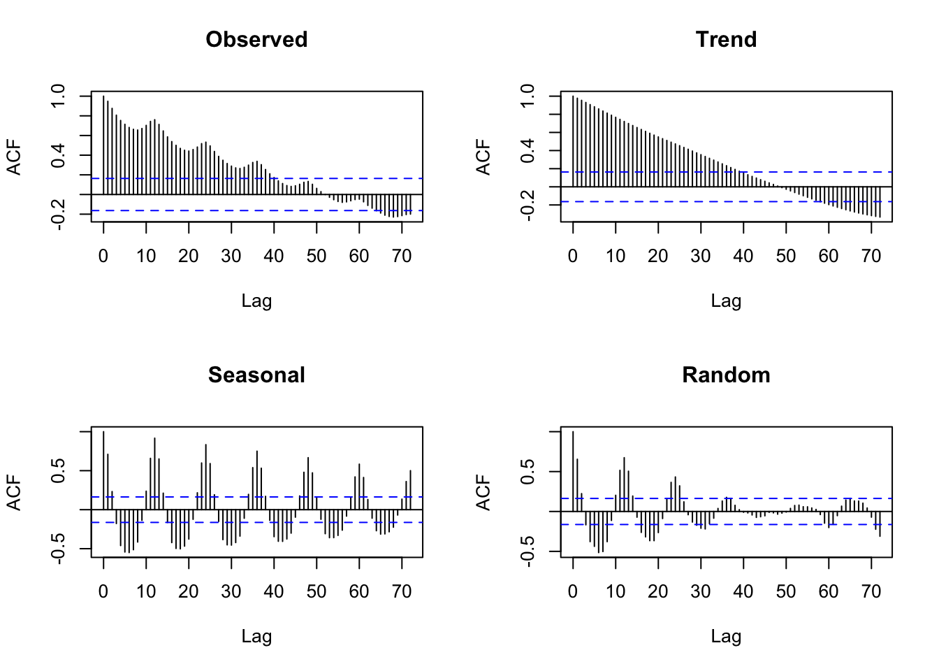 The seasonal component shows persistent (non-decaying) positive autocorrelation spikes at time lags \(k = 12, 24, 36, \ldots\). This is the typical pattern of strong deterministic seasonality.