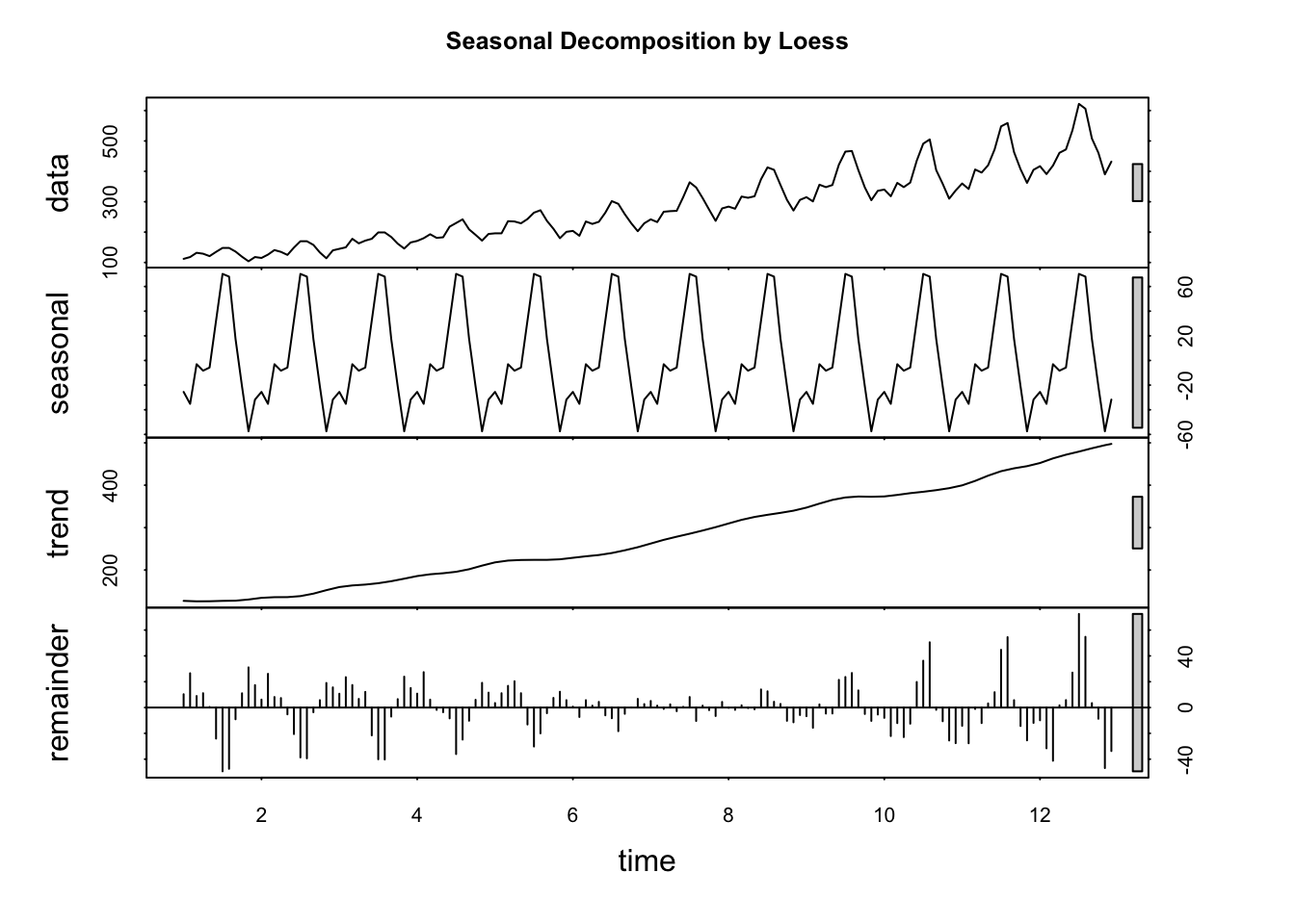 The decomposition of a time series may provide insight into the relative importance of the long-run trend and seasonality. The production manager may be interested in the seasonal component because it shows how the total variance of sales depends on seasonal fluctuations. If the rate of production is nearly constant and if it is necessary to deliver goods on demand (retailers don’t want to keep a large inventory) then it is obvious that the company needs to stock overproduction (in months with low demand) to meet the orders in months with high demand (and insufficient production capacity).