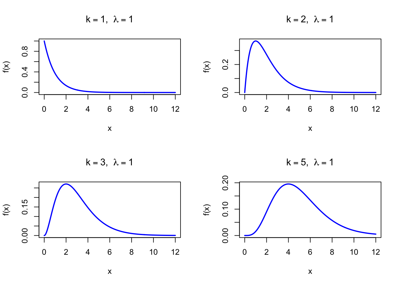 par(mfrow =c(2, 2))x <-seq(0, 12, length =500)plot(x, dgamma(x, shape =1, rate =1), type ="l", lwd =2, col ="blue",xlab ="x", ylab ="f(x)", main =expression(paste(k ==1, ", ", lambda ==1)))plot(x, dgamma(x, shape =2, rate =1), type ="l", lwd =2, col ="blue",xlab ="x", ylab ="f(x)", main =expression(paste(k ==2, ", ", lambda ==1)))plot(x, dgamma(x, shape =3, rate =1), type ="l", lwd =2, col ="blue",xlab ="x", ylab ="f(x)", main =expression(paste(k ==3, ", ", lambda ==1)))plot(x, dgamma(x, shape =5, rate =1), type ="l", lwd =2, col ="blue",xlab ="x", ylab ="f(x)", main =expression(paste(k ==5, ", ", lambda ==1)))par(mfrow =c(1, 1))