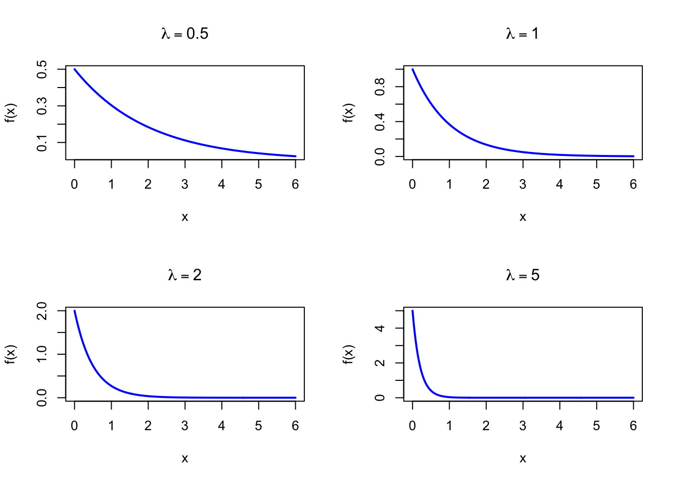 par(mfrow =c(2, 2))x <-seq(0, 6, length =500)plot(x, dexp(x, rate =0.5), type ="l", lwd =2, col ="blue",xlab ="x", ylab ="f(x)", main =expression(lambda ==0.5))plot(x, dexp(x, rate =1), type ="l", lwd =2, col ="blue",xlab ="x", ylab ="f(x)", main =expression(lambda ==1))plot(x, dexp(x, rate =2), type ="l", lwd =2, col ="blue",xlab ="x", ylab ="f(x)", main =expression(lambda ==2))plot(x, dexp(x, rate =5), type ="l", lwd =2, col ="blue",xlab ="x", ylab ="f(x)", main =expression(lambda ==5))par(mfrow =c(1, 1))
