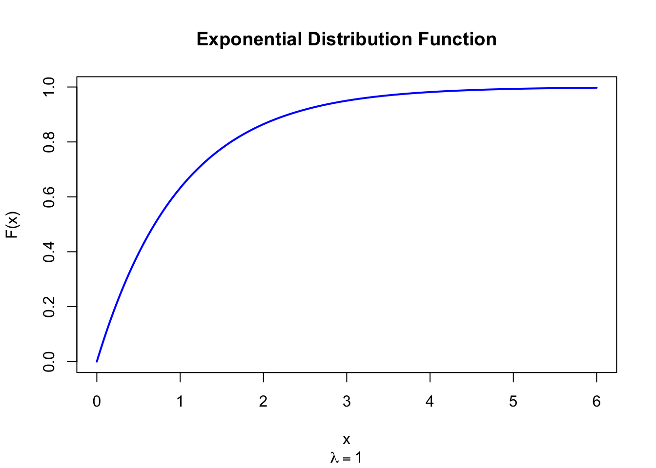 x <-seq(0, 6, length =500)plot(x, pexp(x, rate =1), type ="l", lwd =2, col ="blue",xlab ="x", ylab ="F(x)", main ="Exponential Distribution Function",sub =expression(lambda ==1))