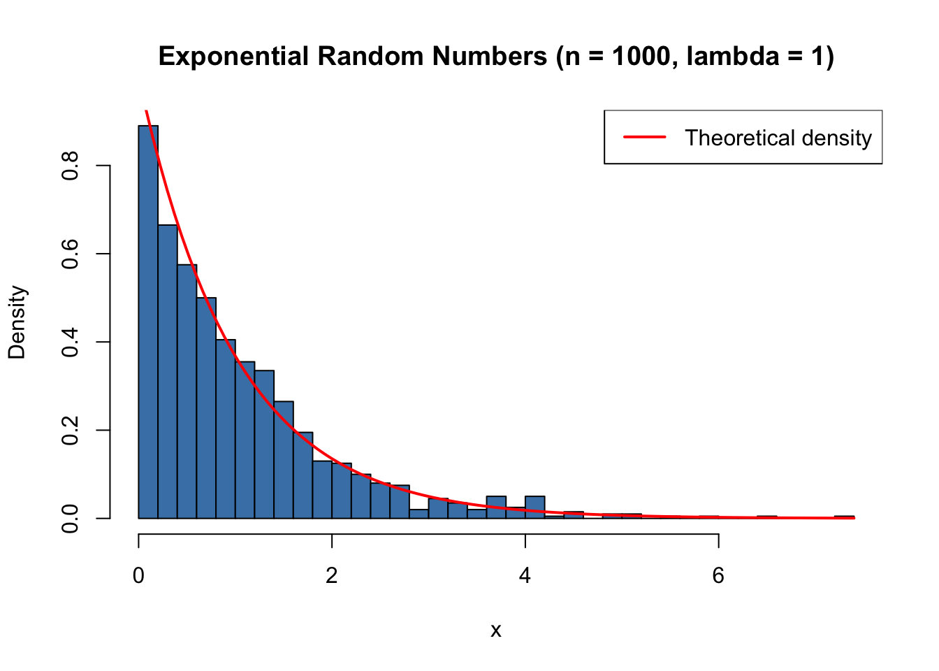 set.seed(123)x <-rexp(1000, rate =1)hist(x, breaks =30, col ="steelblue", freq =FALSE,xlab ="x", main ="Exponential Random Numbers (n = 1000, lambda = 1)")curve(dexp(x, rate =1), add =TRUE, col ="red", lwd =2)legend("topright", legend ="Theoretical density", col ="red", lwd =2)