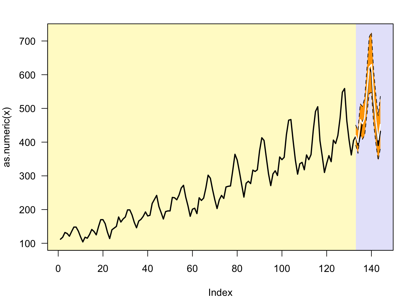 library(lattice)x <- AirPassengers # placeholder dataset for the generic templatepar1 =12#cut off periodspar2 =0.0#Box-Cox lambda transformation parameterpar3 =1#degree of non-seasonal differencingpar4 =1#degree of seasonal differencingpar5 =12#seasonal periodpar6 =0#degree (p) of the non-seasonal AR(p) polynomialpar7 =1#degree (q) of the non-seasonal MA(q) polynomialpar8 =0#degree (P) of the seasonal AR(P) polynomialpar9 =1#degree (Q) of the seasonal MA(Q) polynomialpar10 =FALSE#Include mean?if (par2 ==0) x <-log(x)if (par2 !=0) x <- x^par2lx <-length(x)first <- lx -2*par1nx <- lx - par1nx1 <- nx +1fx <- lx - nxif (fx <1) { fx <- par5*2 nx1 <- lx + fx -1 first <- lx -2*fx}first <-1if (fx <3) fx <-round(lx/10,0)arima.out <-arima(x[1:nx], order=c(par6,par3,par7), seasonal=list(order=c(par8,par4,par9), period=par5), include.mean=par10, method='ML')forecast <-predict(arima.out,fx)lb <- forecast$pred -1.96* forecast$seub <- forecast$pred +1.96* forecast$seif (par2 ==0) { x <-exp(x) forecast$pred <-exp(forecast$pred) lb <-exp(lb) ub <-exp(ub)}if (par2 !=0) { x <- x^(1/par2) forecast$pred <- forecast$pred^(1/par2) lb <- lb^(1/par2) ub <- ub^(1/par2)}if (par2 <0) { olb <- lb lb <- ub ub <- olb}actandfor <-c(x[1:nx], forecast$pred)perc.se <- (ub-forecast$pred)/1.96/forecast$predopar <-par(mar=c(4,4,2,2),las=1)ylim <-c( min(x[first:nx],lb), max(x[first:nx],ub))plot(as.numeric(x),ylim=ylim,type='n',xlim=c(first,lx))usr <-par('usr')rect(usr[1],usr[3],nx+1,usr[4],border=NA,col='lemonchiffon')rect(nx1,usr[3],usr[2],usr[4],border=NA,col='lavender')abline(h= (-3:3)*2 , col ='gray', lty =3)polygon( c(nx1:lx,lx:nx1), c(lb,rev(ub)), col ='orange', lty=2,border=NA)lines(nx1:lx, lb , lty=2)lines(nx1:lx, ub , lty=2)lines(as.numeric(x), lwd=2)lines(nx1:lx, forecast$pred , lwd=2 , col ='white')box()