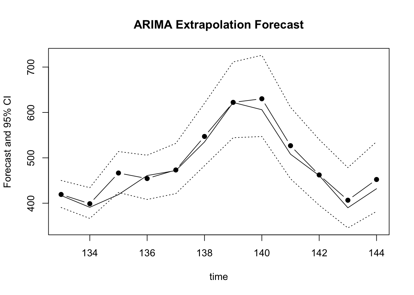 The extrapolation forecast clearly captures the seasonal pattern and the local trend, as can be observed in the figure near the bottom of the output. The figure also shows that the forecast track is closely aligned with the actual values from the cut-off period. In addition, the actual values are included in the 95% prediction intervals, indicating that the observed forecast errors are compatible with the model’s expected uncertainty for \(t = 361, 362, …, 372\).