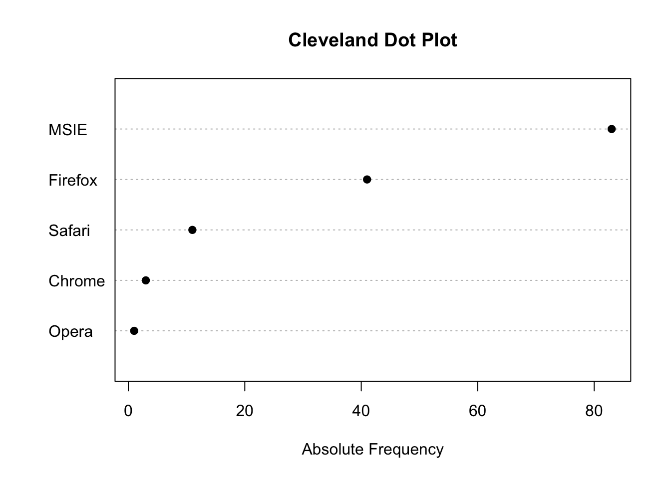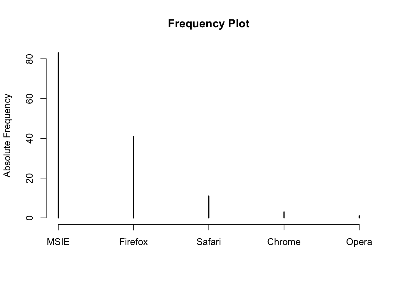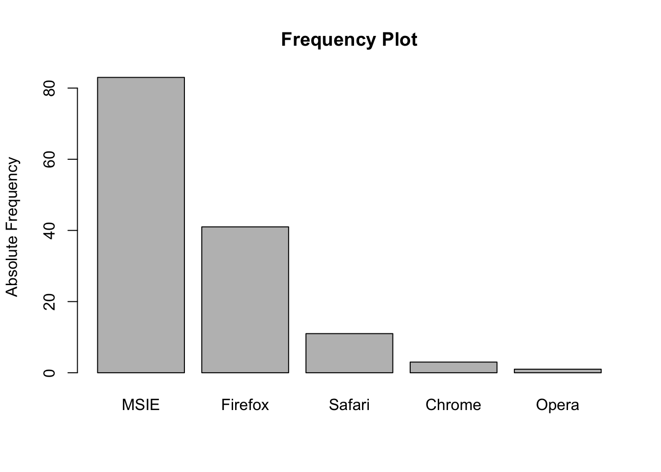 x <- c('Firefox','MSIE','MSIE','MSIE','MSIE','Firefox','Firefox','MSIE','Chrome','Firefox','Firefox','MSIE','MSIE','MSIE','MSIE','MSIE','Firefox','MSIE','Firefox','Firefox','MSIE','Firefox','Firefox','MSIE','MSIE','Firefox','Firefox','Safari','MSIE','Firefox','MSIE','MSIE','MSIE','Firefox','MSIE','MSIE','Firefox','MSIE','MSIE','MSIE','Firefox','MSIE','MSIE','Firefox','Opera','Firefox','MSIE','MSIE','MSIE','Firefox','Firefox','Safari','Firefox','Firefox','MSIE','MSIE','MSIE','Firefox','Safari','MSIE','MSIE','MSIE','MSIE','Firefox','MSIE','Chrome','MSIE','Firefox','Safari','Safari','Firefox','MSIE','MSIE','Firefox','MSIE','MSIE','MSIE','MSIE','Firefox','MSIE','MSIE','MSIE','MSIE','Firefox','MSIE','Firefox','Safari','Firefox','MSIE','MSIE','MSIE','MSIE','MSIE','MSIE','MSIE','Safari','Firefox','MSIE','Firefox','MSIE','MSIE','MSIE','MSIE','MSIE','Firefox','MSIE','Firefox','MSIE','MSIE','MSIE','Firefox','MSIE','MSIE','MSIE','Safari','MSIE','Firefox','Firefox','MSIE','Safari','Safari','Firefox','MSIE','MSIE','MSIE','MSIE','Chrome','MSIE','Firefox','MSIE','MSIE','MSIE','MSIE','Firefox','Safari','MSIE','MSIE','MSIE','MSIE')