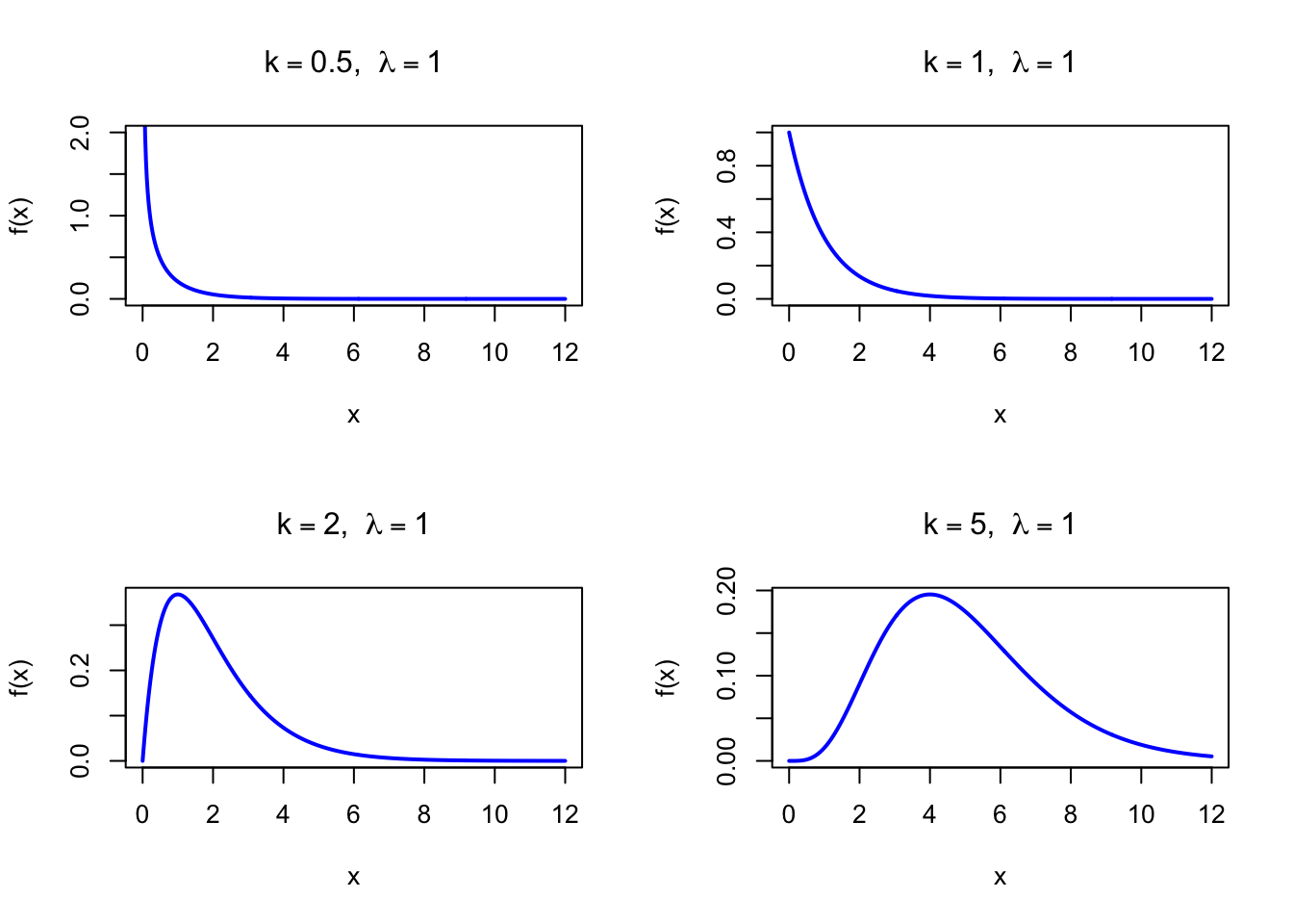 par(mfrow =c(2, 2))x <-seq(0, 12, length =500)plot(x, dgamma(x, shape =0.5, rate =1), type ="l", lwd =2, col ="blue",xlab ="x", ylab ="f(x)", main =expression(paste(k ==0.5, ", ", lambda ==1)),ylim =c(0, 2))plot(x, dgamma(x, shape =1, rate =1), type ="l", lwd =2, col ="blue",xlab ="x", ylab ="f(x)", main =expression(paste(k ==1, ", ", lambda ==1)))plot(x, dgamma(x, shape =2, rate =1), type ="l", lwd =2, col ="blue",xlab ="x", ylab ="f(x)", main =expression(paste(k ==2, ", ", lambda ==1)))plot(x, dgamma(x, shape =5, rate =1), type ="l", lwd =2, col ="blue",xlab ="x", ylab ="f(x)", main =expression(paste(k ==5, ", ", lambda ==1)))par(mfrow =c(1, 1))