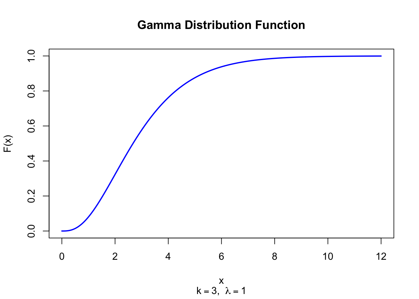 x <-seq(0, 12, length =500)plot(x, pgamma(x, shape =3, rate =1), type ="l", lwd =2, col ="blue",xlab ="x", ylab ="F(x)", main ="Gamma Distribution Function",sub =expression(paste(k ==3, ", ", lambda ==1)))