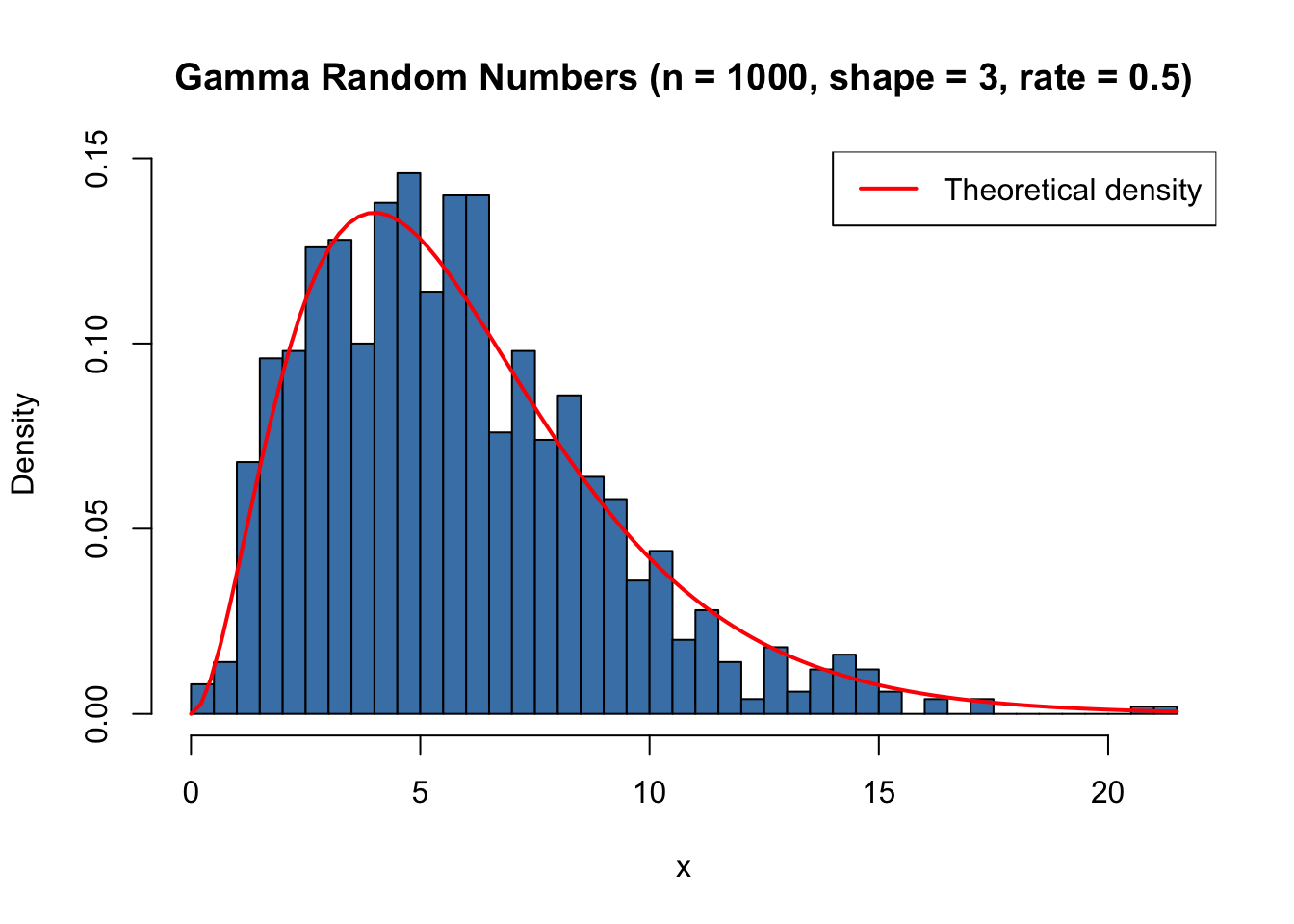 set.seed(123)x <-rgamma(1000, shape =3, rate =0.5)hist(x, breaks =35, col ="steelblue", freq =FALSE,xlab ="x", main ="Gamma Random Numbers (n = 1000, shape = 3, rate = 0.5)")curve(dgamma(x, shape =3, rate =0.5), add =TRUE, col ="red", lwd =2)legend("topright", legend ="Theoretical density", col ="red", lwd =2)