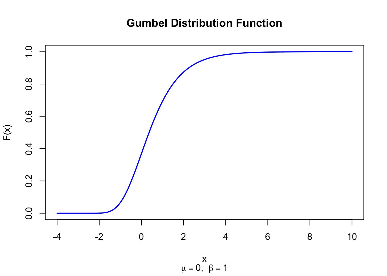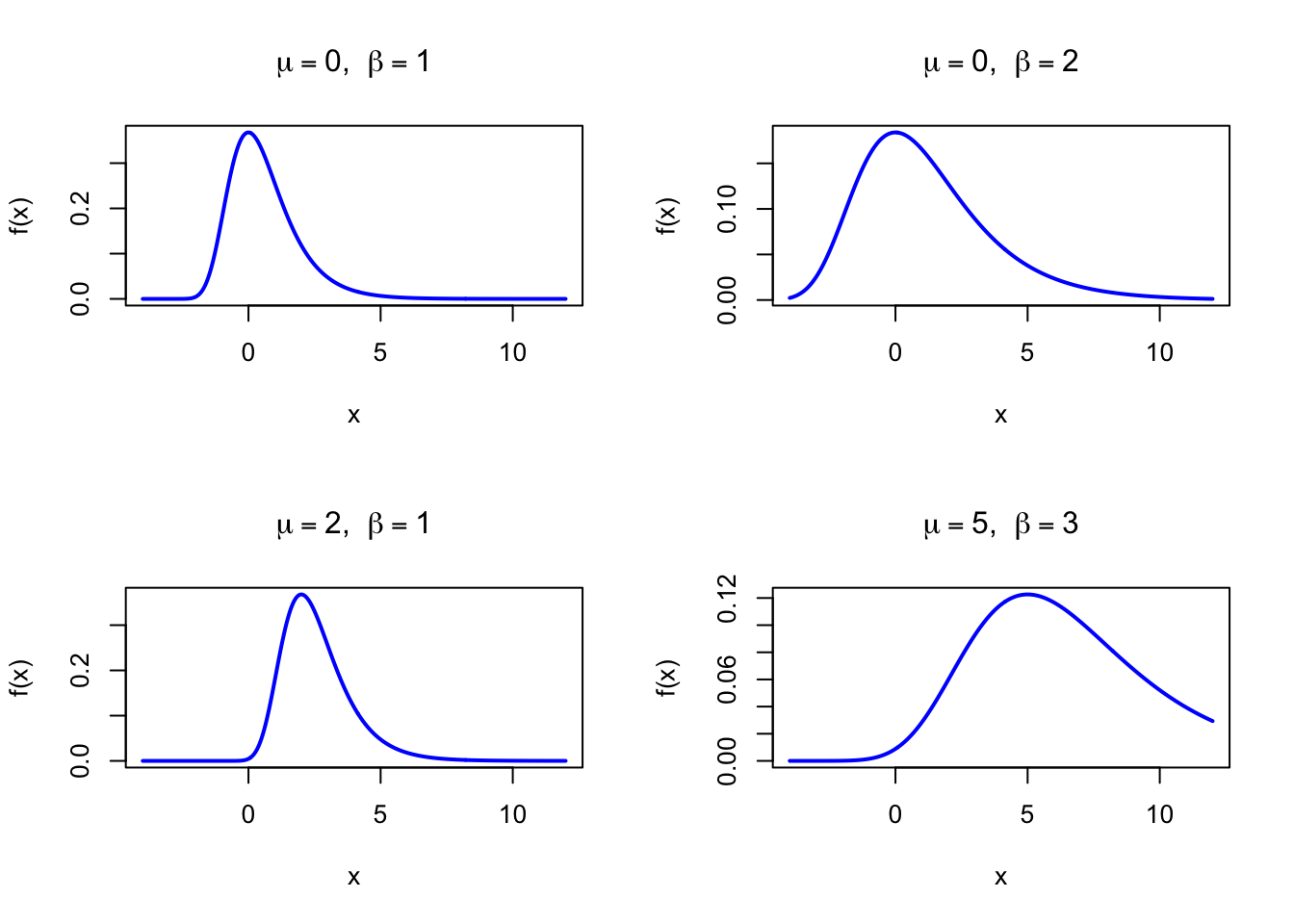 dgumbel <-function(x, mu, beta) { z <- (x - mu) / betaexp(-z -exp(-z)) / beta}par(mfrow =c(2, 2))x <-seq(-4, 12, length =500)plot(x, dgumbel(x, 0, 1), type ="l", lwd =2, col ="blue",xlab ="x", ylab ="f(x)", main =expression(paste(mu ==0, ", ", beta ==1)))plot(x, dgumbel(x, 0, 2), type ="l", lwd =2, col ="blue",xlab ="x", ylab ="f(x)", main =expression(paste(mu ==0, ", ", beta ==2)))plot(x, dgumbel(x, 2, 1), type ="l", lwd =2, col ="blue",xlab ="x", ylab ="f(x)", main =expression(paste(mu ==2, ", ", beta ==1)))plot(x, dgumbel(x, 5, 3), type ="l", lwd =2, col ="blue",xlab ="x", ylab ="f(x)", main =expression(paste(mu ==5, ", ", beta ==3)))par(mfrow =c(1, 1))