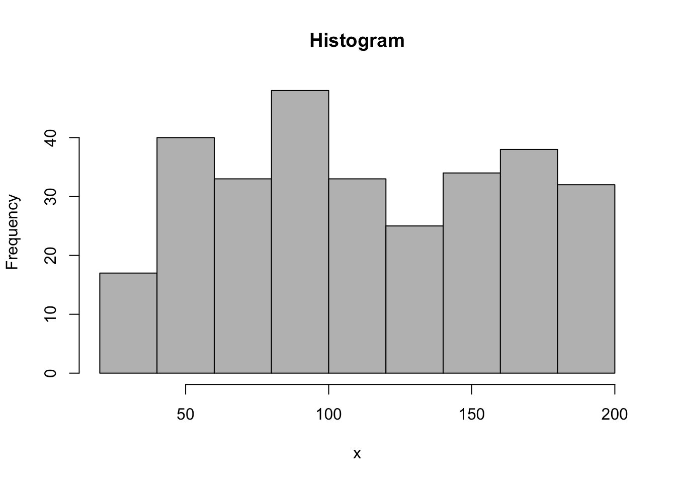 x <-runif(300,30,200)par1 ='Sturges'#number of binspar2 ='grey'#colourpar3 =FALSE#right-closed intervalsxlab ='x'main ='Histogram'myhist<-hist(x,breaks=par1,col=par2,main=main,xlab=xlab,right=par3)