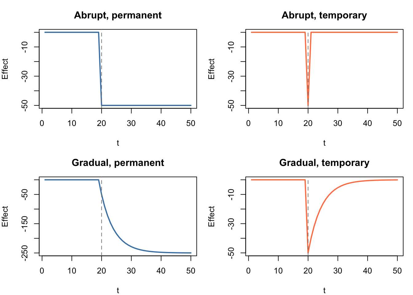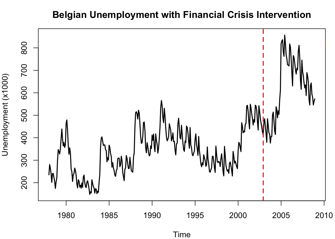 # Step intervention at the financial crisis (around observation 300, late 2008)