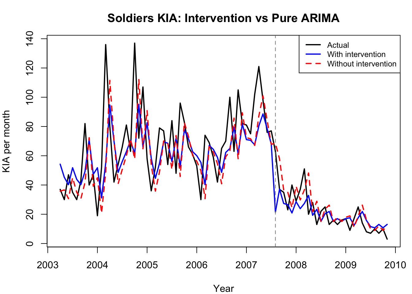 # Fit ARIMA with intervention (using same order as in estARIMA.qmd)
