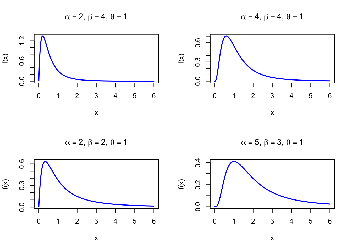 dbetaprime <-function(x, alpha, beta, theta =1) {ifelse(x >0, (x/theta)^(alpha-1) * (1+ x/theta)^(-alpha-beta) / (theta *beta(alpha, beta)),0)}par(mfrow =c(2, 2))x <-seq(0.001, 6, length =500)plot(x, dbetaprime(x, 2, 4, 1), type ="l", lwd =2, col ="blue",xlab ="x", ylab ="f(x)", main =expression(paste(alpha==2, ", ", beta==4, ", ", theta==1)))plot(x, dbetaprime(x, 4, 4, 1), type ="l", lwd =2, col ="blue",xlab ="x", ylab ="f(x)", main =expression(paste(alpha==4, ", ", beta==4, ", ", theta==1)))plot(x, dbetaprime(x, 2, 2, 1), type ="l", lwd =2, col ="blue",xlab ="x", ylab ="f(x)", main =expression(paste(alpha==2, ", ", beta==2, ", ", theta==1)))plot(x, dbetaprime(x, 5, 3, 1), type ="l", lwd =2, col ="blue",xlab ="x", ylab ="f(x)", main =expression(paste(alpha==5, ", ", beta==3, ", ", theta==1)))par(mfrow =c(1, 1))