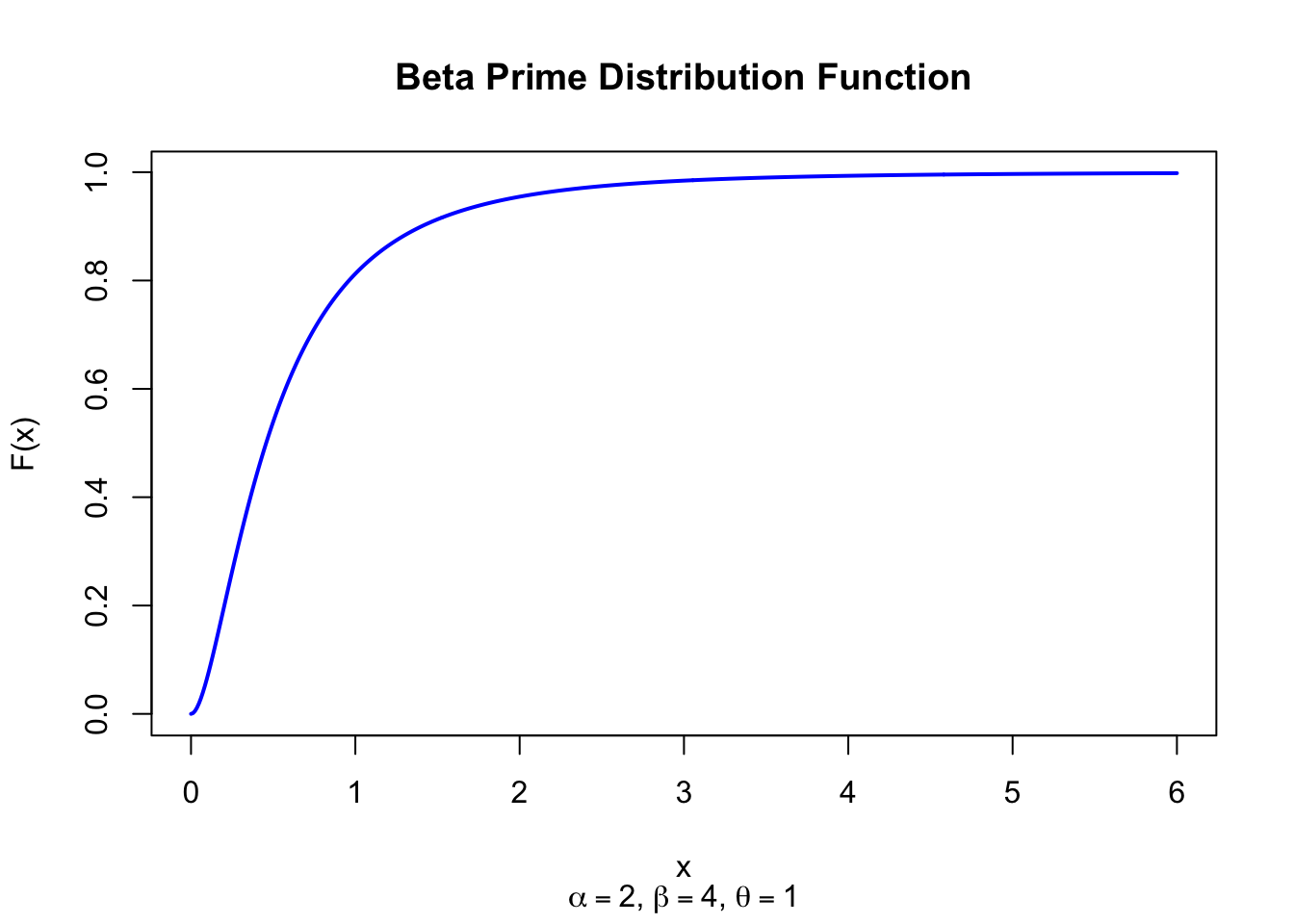 pbetaprime <-function(x, alpha, beta, theta =1) {ifelse(x >0, pbeta(x / (x + theta), shape1 = alpha, shape2 = beta), 0)}x <-seq(0, 6, length =500)plot(x, pbetaprime(x, 2, 4, 1), type ="l", lwd =2, col ="blue",xlab ="x", ylab ="F(x)", main ="Beta Prime Distribution Function",sub =expression(paste(alpha==2, ", ", beta==4, ", ", theta==1)))