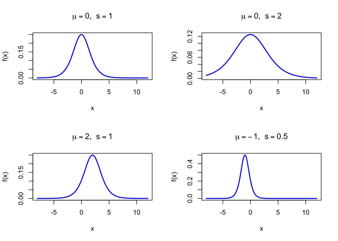 par(mfrow =c(2, 2))x <-seq(-8, 12, length =500)plot(x, dlogis(x, location =0, scale =1), type ="l", lwd =2, col ="blue",xlab ="x", ylab ="f(x)", main =expression(paste(mu ==0, ", ", s ==1)))plot(x, dlogis(x, location =0, scale =2), type ="l", lwd =2, col ="blue",xlab ="x", ylab ="f(x)", main =expression(paste(mu ==0, ", ", s ==2)))plot(x, dlogis(x, location =2, scale =1), type ="l", lwd =2, col ="blue",xlab ="x", ylab ="f(x)", main =expression(paste(mu ==2, ", ", s ==1)))plot(x, dlogis(x, location =-1, scale =0.5), type ="l", lwd =2, col ="blue",xlab ="x", ylab ="f(x)", main =expression(paste(mu ==-1, ", ", s ==0.5)))par(mfrow =c(1, 1))