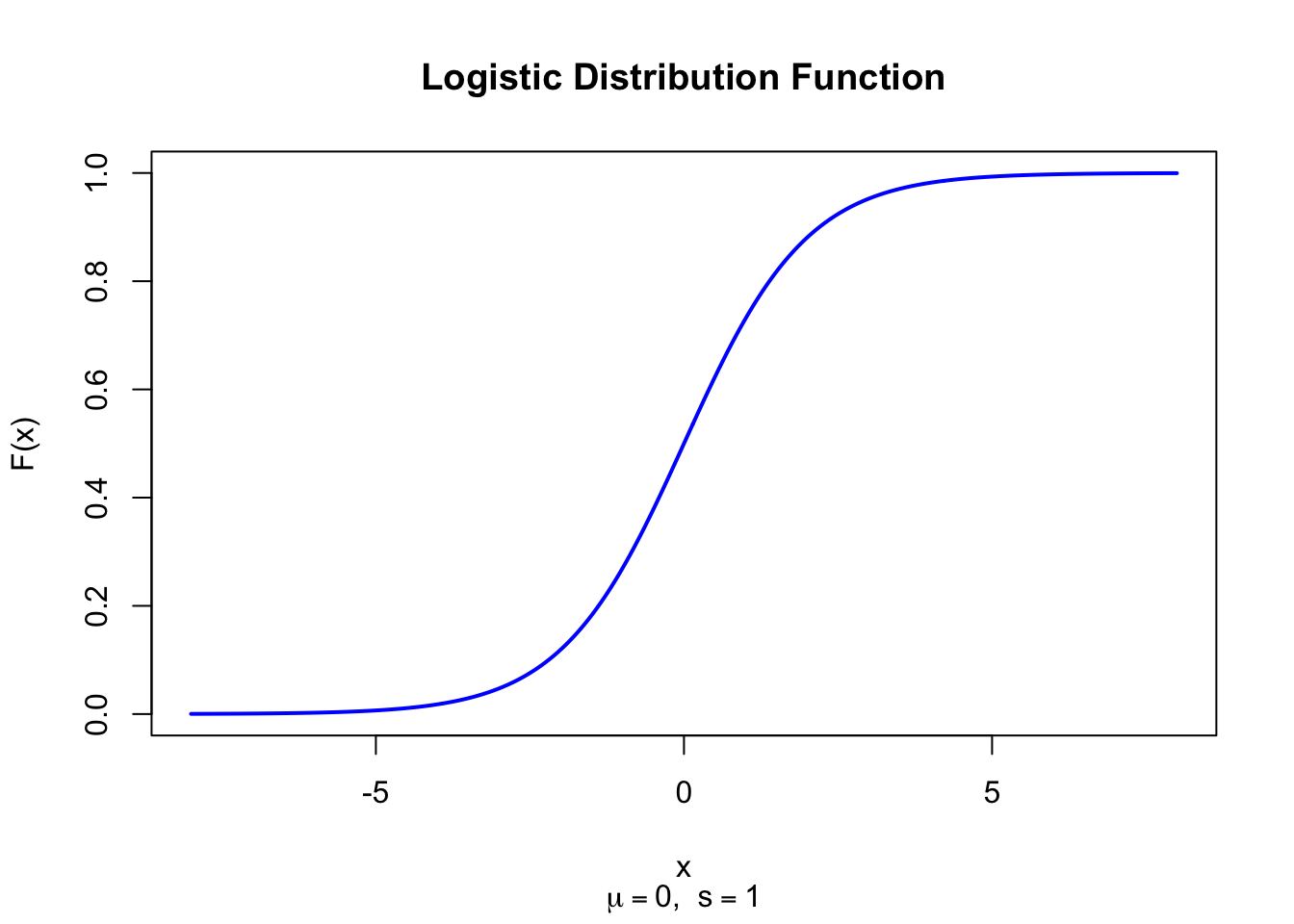 x <-seq(-8, 8, length =500)plot(x, plogis(x, location =0, scale =1), type ="l", lwd =2, col ="blue",xlab ="x", ylab ="F(x)", main ="Logistic Distribution Function",sub =expression(paste(mu ==0, ", ", s ==1)))