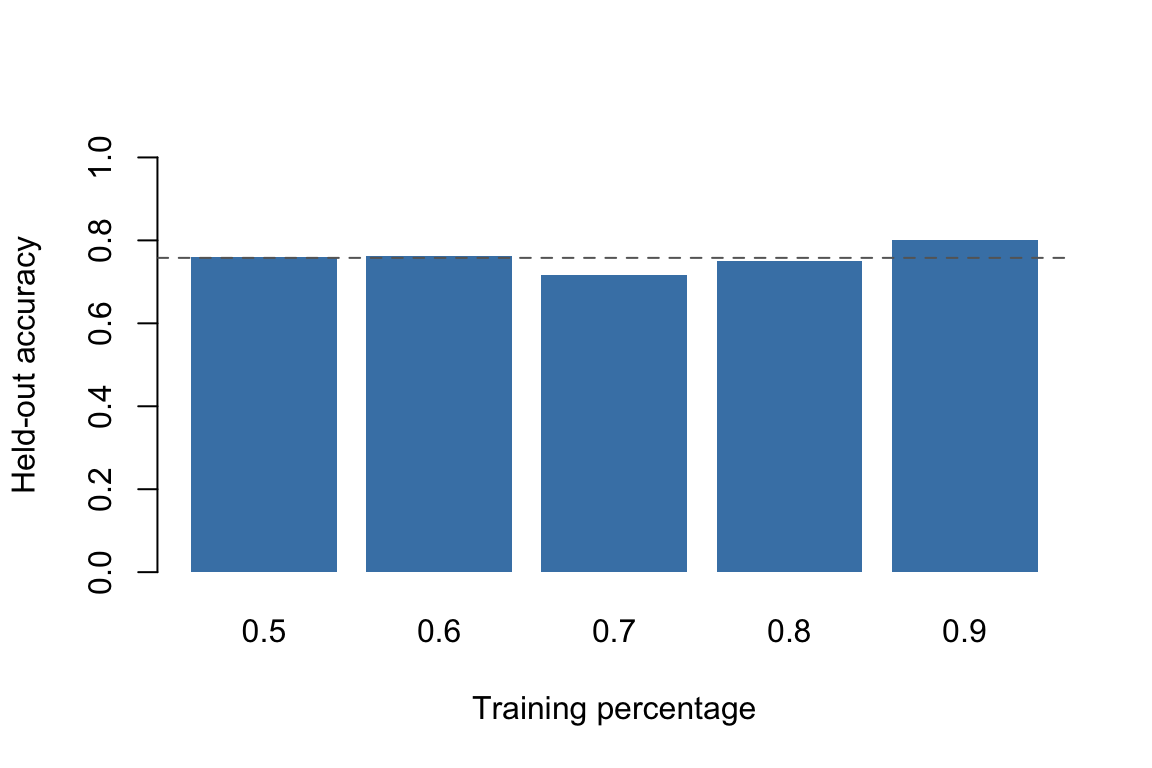 Each bar represents a single random split. If you run this code again with a different seed, the bars will change — sometimes substantially. That instability is exactly the problem that repeated holdout (Section 160.3) is designed to address.
