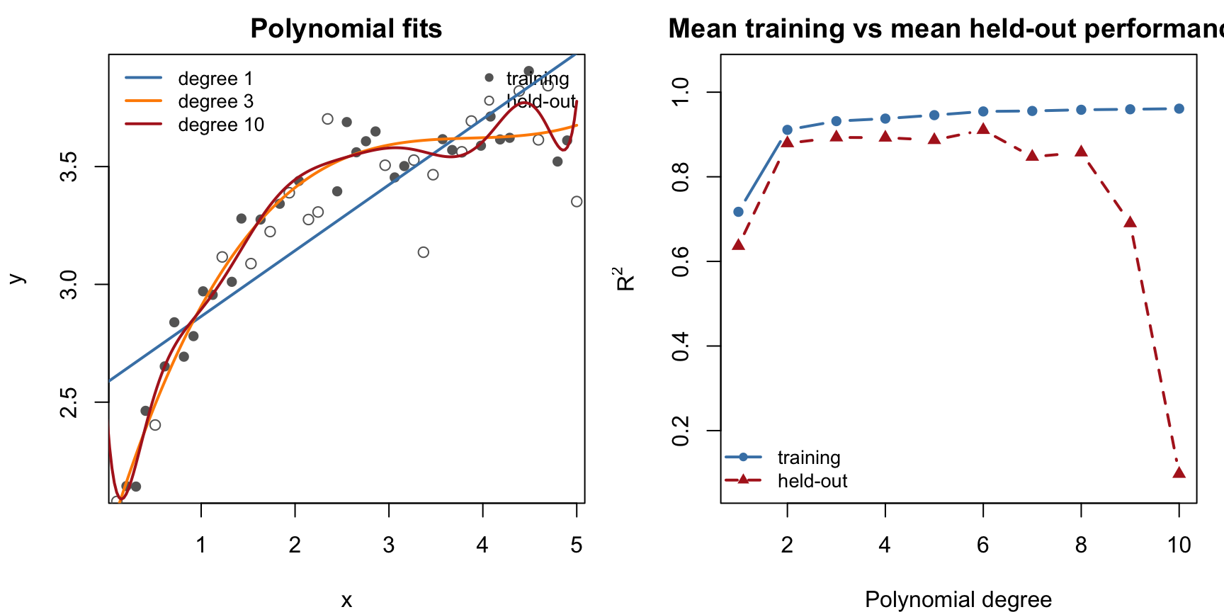 The left panel shows that the degree-10 polynomial follows much more of the local variation than the lower-degree fits. The right panel shows that the mean held-out \(R^2\) drops once model flexibility becomes excessive, even though mean training \(R^2\) continues to rise. The point where the two lines diverge is where overfitting begins.