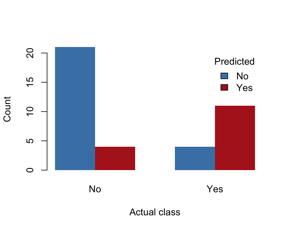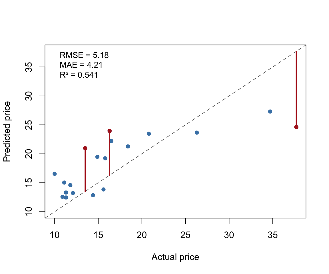 The three red segments connect the largest prediction errors to the diagonal. These are the observations that contribute most to the RMSE. If the squared penalty matters (as it does in RMSE), the model’s performance is substantially driven by its worst predictions.