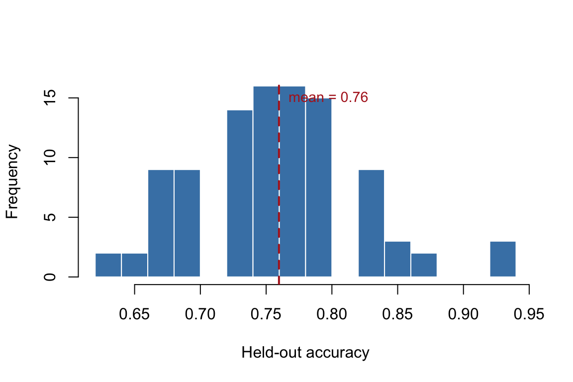 Distribution of held-out accuracy across 100 repeated holdout splits