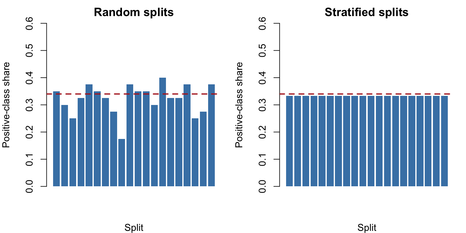 The random splits show visible wobble in the positive-class share. The stratified splits cluster tightly around the true proportion (dashed line). When the dataset is small or the class balance is uneven, stratification prevents accidental evaluation on an unrepresentative test set.