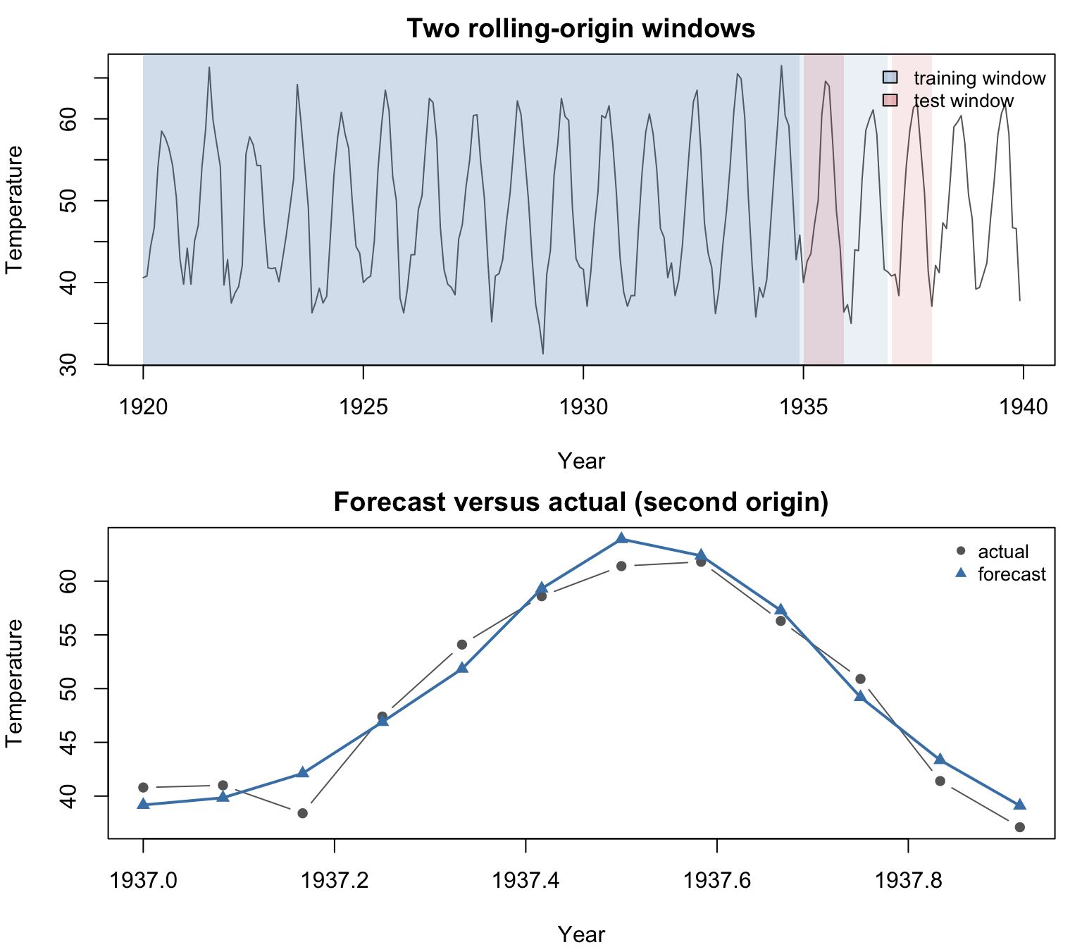 Rolling-origin validation on the nottem series. Top: two training windows (blue) and their corresponding test windows (red). Bottom: forecast versus actual for the second origin.