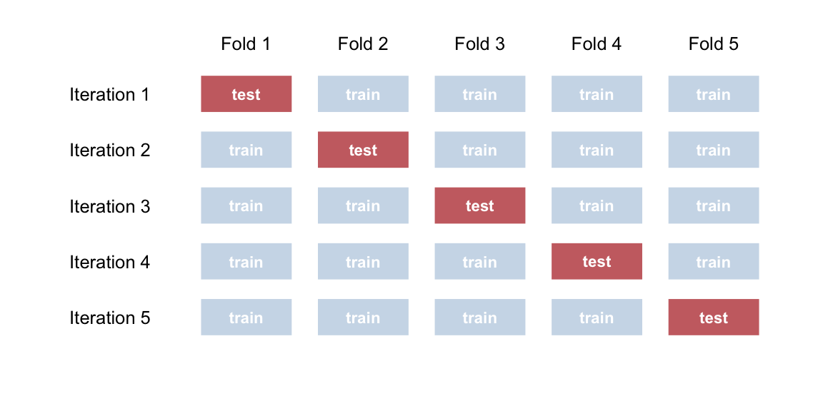 par(mar =c(2, 6, 2, 1))k <-5plot(NULL, xlim =c(0.5, k +0.5), ylim =c(0.5, k +0.5),xlab ="", ylab ="", xaxt ="n", yaxt ="n", bty ="n",main ="")for (i in1:k) {for (j in1:k) { col <-if (j == i) "firebrick"else"steelblue" alpha <-if (j == i) 0.7else0.3rect(j -0.4, k - i +1-0.35, j +0.4, k - i +1+0.35,col =adjustcolor(col, alpha.f = alpha), border ="white", lwd =2) label <-if (j == i) "test"else"train"text(j, k - i +1, label, cex =0.7, col ="white", font =2) }mtext(paste("Iteration", i), side =2, at = k - i +1, las =1, cex =0.8, line =0.5)}mtext(paste("Fold", 1:k), side =3, at =1:k, cex =0.8)