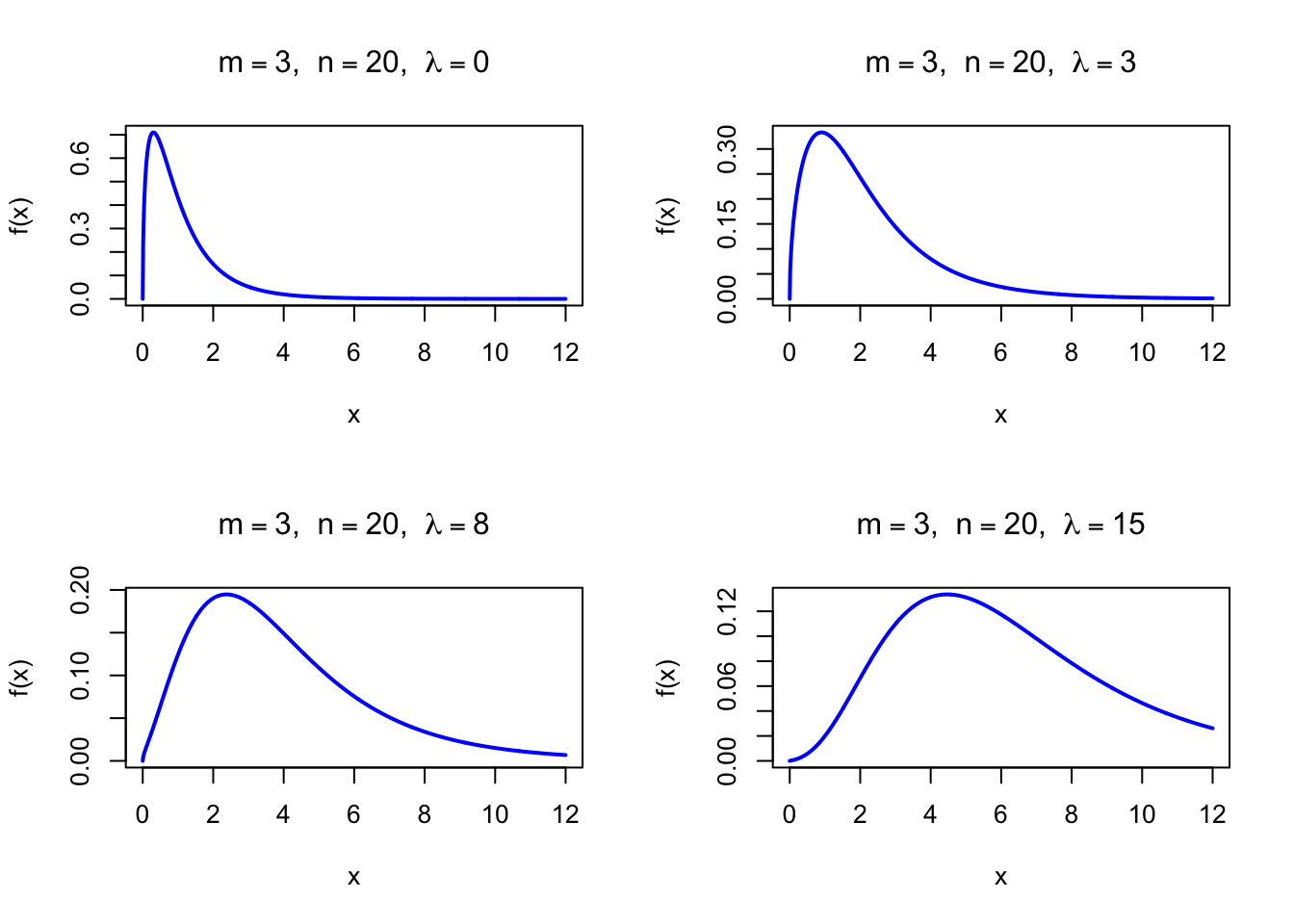 par(mfrow =c(2, 2))x <-seq(0, 12, length =1000)plot(x, df(x, df1 =3, df2 =20, ncp =0), type ="l", lwd =2, col ="blue",xlab ="x", ylab ="f(x)", main =expression(paste(m ==3, ", ", n ==20, ", ", lambda ==0)))plot(x, df(x, df1 =3, df2 =20, ncp =3), type ="l", lwd =2, col ="blue",xlab ="x", ylab ="f(x)", main =expression(paste(m ==3, ", ", n ==20, ", ", lambda ==3)))plot(x, df(x, df1 =3, df2 =20, ncp =8), type ="l", lwd =2, col ="blue",xlab ="x", ylab ="f(x)", main =expression(paste(m ==3, ", ", n ==20, ", ", lambda ==8)))plot(x, df(x, df1 =3, df2 =20, ncp =15), type ="l", lwd =2, col ="blue",xlab ="x", ylab ="f(x)", main =expression(paste(m ==3, ", ", n ==20, ", ", lambda ==15)))par(mfrow =c(1, 1))