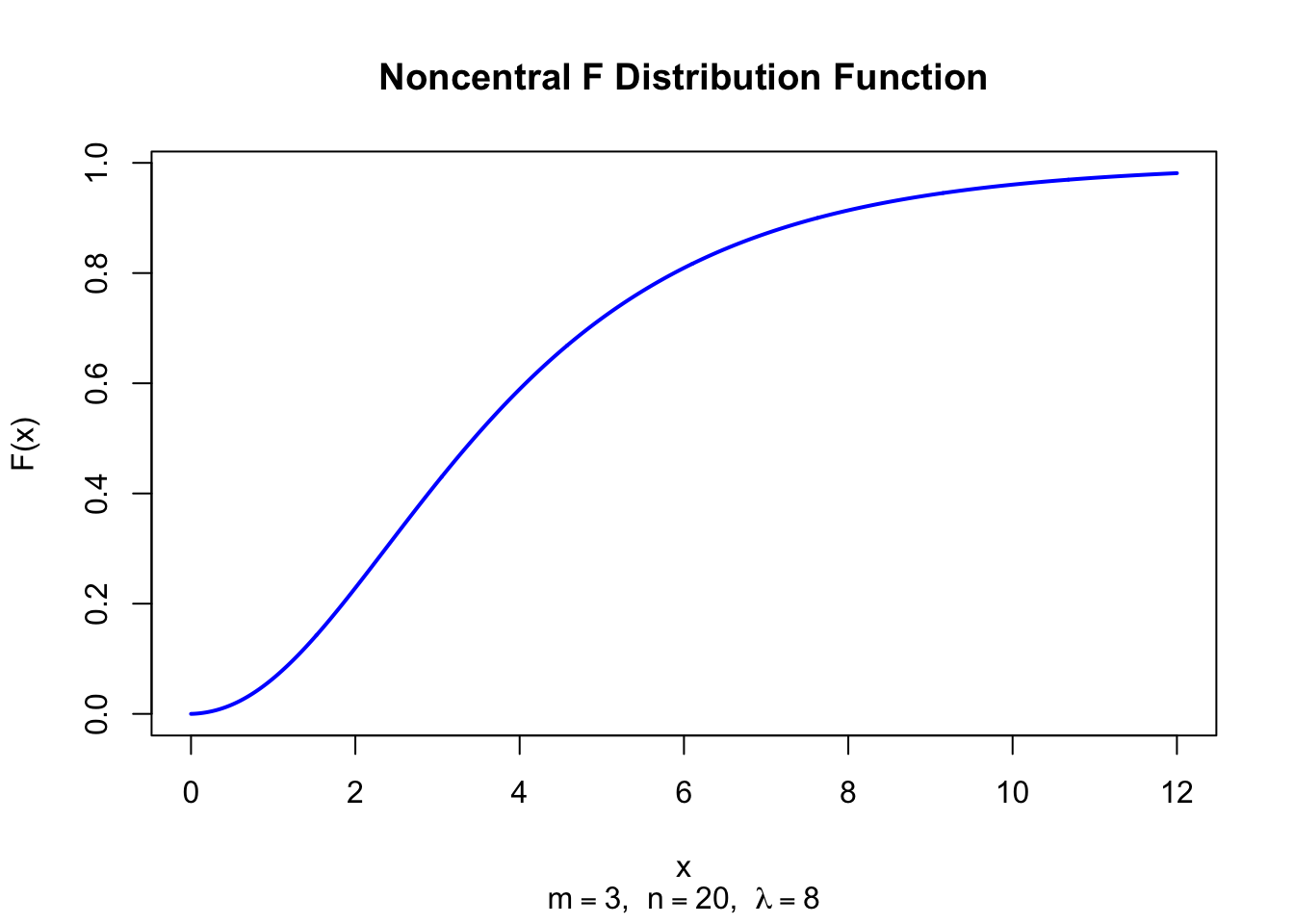 x <-seq(0, 12, length =1000)plot(x, pf(x, df1 =3, df2 =20, ncp =8), type ="l", lwd =2, col ="blue",xlab ="x", ylab ="F(x)", main ="Noncentral F Distribution Function",sub =expression(paste(m ==3, ", ", n ==20, ", ", lambda ==8)))