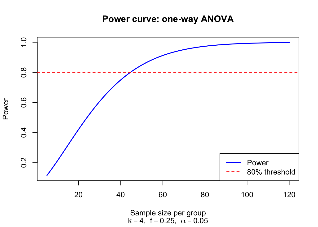 k <-4# number of groupsf <-0.25# Cohen's f (medium effect)alpha <-0.05# significance level# Compute power for group sizes from 10 to 80n_per_group <-seq(10, 80, by =5)power <-numeric(length(n_per_group))for (i inseq_along(n_per_group)) { n_g <- n_per_group[i] df1 <- k -1 df2 <- k * (n_g -1) lambda <- k * n_g * f^2 f_crit <-qf(1- alpha, df1 = df1, df2 = df2) power[i] <-1-pf(f_crit, df1 = df1, df2 = df2, ncp = lambda)}result <-data.frame(n_per_group = n_per_group,N_total = k * n_per_group,lambda = k * n_per_group * f^2,power =round(power, 4))print(result)# Find minimum group size for 80% powern_required <- n_per_group[which(power >=0.80)[1]]cat("\nMinimum per-group sample size for 80% power:", n_required, "\n")cat("Total sample size:", k * n_required, "\n")