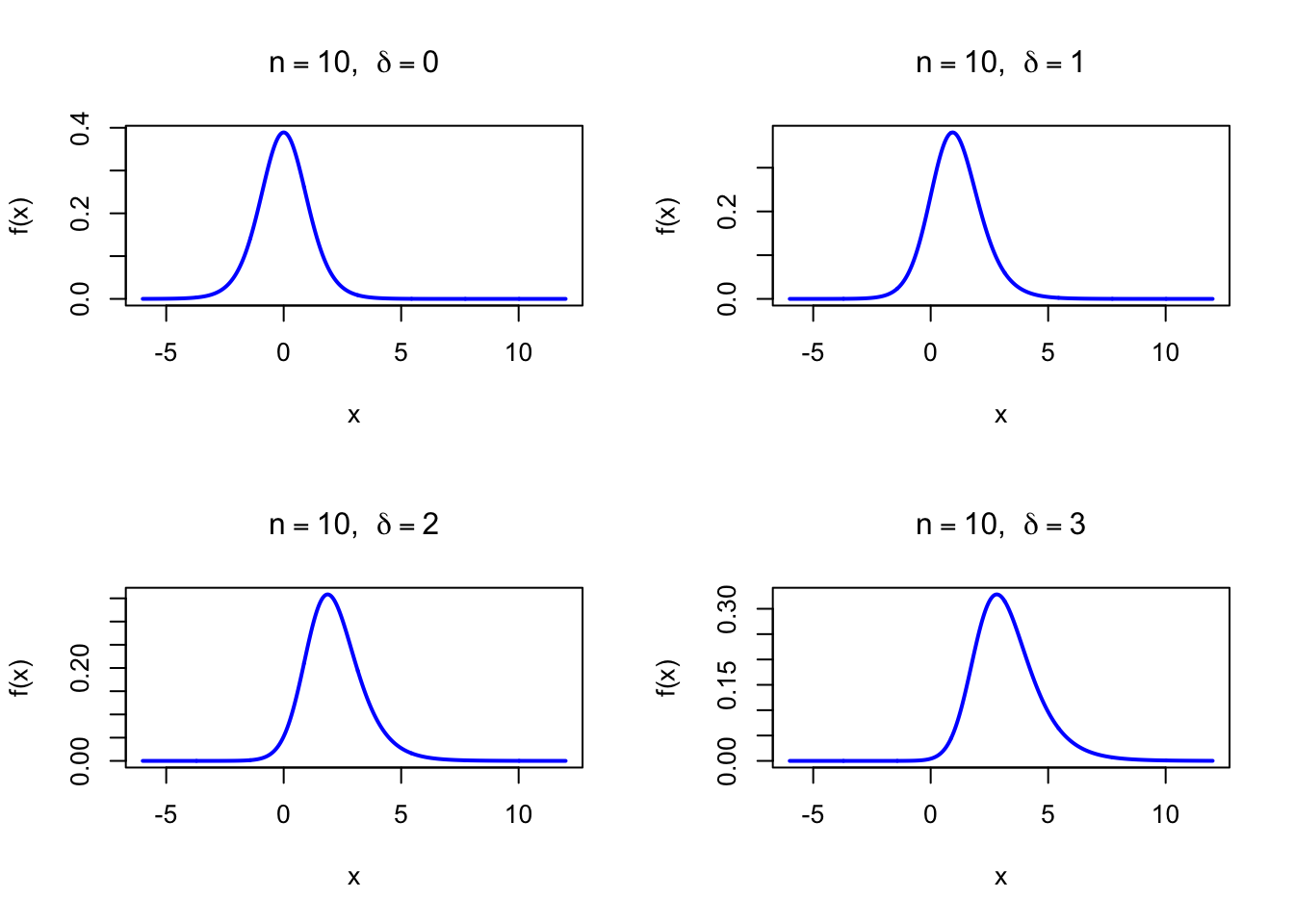 par(mfrow =c(2, 2))x <-seq(-6, 12, length =1000)plot(x, dt(x, df =10, ncp =0), type ="l", lwd =2, col ="blue",xlab ="x", ylab ="f(x)", main =expression(paste(n ==10, ", ", delta ==0)))plot(x, dt(x, df =10, ncp =1), type ="l", lwd =2, col ="blue",xlab ="x", ylab ="f(x)", main =expression(paste(n ==10, ", ", delta ==1)))plot(x, dt(x, df =10, ncp =2), type ="l", lwd =2, col ="blue",xlab ="x", ylab ="f(x)", main =expression(paste(n ==10, ", ", delta ==2)))plot(x, dt(x, df =10, ncp =3), type ="l", lwd =2, col ="blue",xlab ="x", ylab ="f(x)", main =expression(paste(n ==10, ", ", delta ==3)))par(mfrow =c(1, 1))