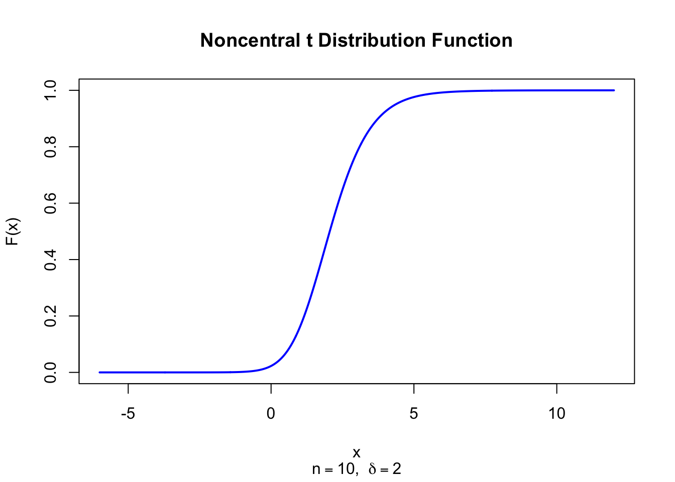x <-seq(-6, 12, length =1000)plot(x, pt(x, df =10, ncp =2), type ="l", lwd =2, col ="blue",xlab ="x", ylab ="F(x)", main ="Noncentral t Distribution Function",sub =expression(paste(n ==10, ", ", delta ==2)))