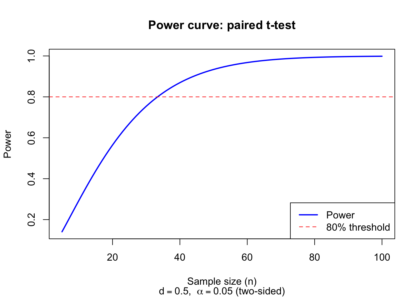 A clinical researcher plans a paired t-test to detect a standardized effect size of \(d = 0.5\) (a medium effect by Cohen’s conventions). Using a two-sided test at \(\alpha = 0.05\), how many subjects are required to achieve 80% power?