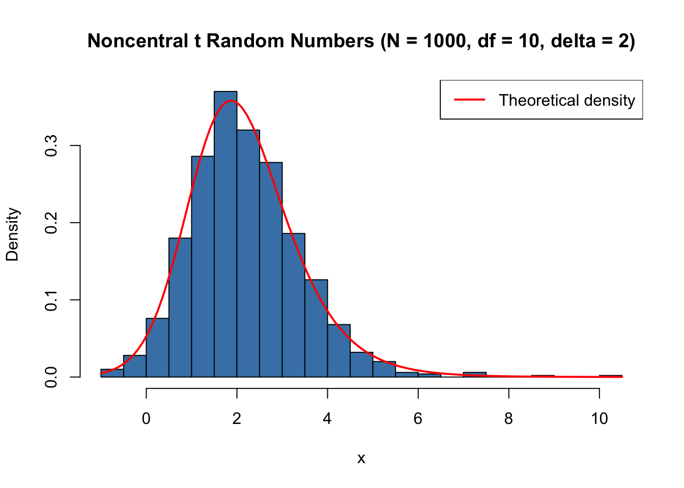 set.seed(123)x <-rt(1000, df =10, ncp =2)hist(x, breaks =40, col ="steelblue", freq =FALSE,xlab ="x", main ="Noncentral t Random Numbers (N = 1000, df = 10, delta = 2)")curve(dt(x, df =10, ncp =2), add =TRUE, col ="red", lwd =2)legend("topright", legend ="Theoretical density", col ="red", lwd =2)