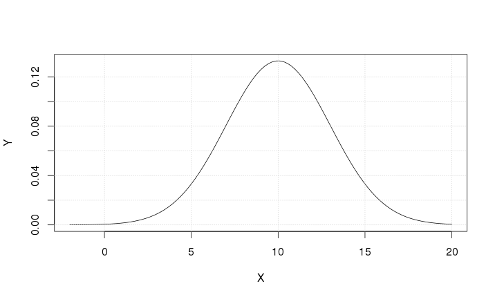\[ Y=\frac {1}{3\sqrt{\text{2$\pi $}}}e^{-\frac {1} {2} \left(\frac{X-10} {3}\right)^2} \]